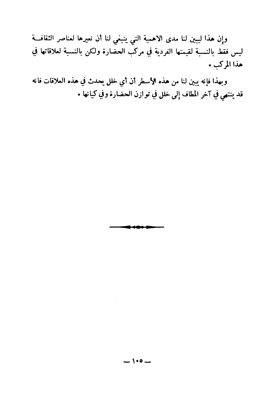 وإن هذا ليبين لنا مدى الأهمية التي ينبغي لنا أن نعيرها لعناصر الثقافة ليس فقط بالنسبة لقيمتها الفردية في مركب الحضارة ولكن بالنسبة لعلاقاتها في هذا المركب.