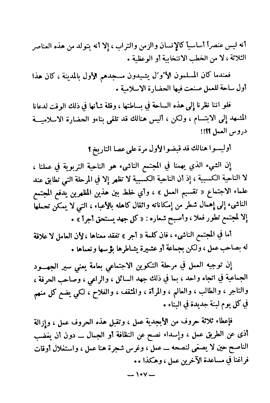 إن الشيء الذي يهمنا في المجتمع الناشىء هو الناحية التربوية في عملنا، لا الناحية الكسبية، إذ أن الناحية الكسبية لا تظهر إلا في المرحلة التي تطابق عند علماء الاجتماع "تقسيم العمل": وأي خلط بين هذين المظهرين يدفع المجتمع الناشىء إلى إهمال شطر من إمكاناته واثقال كاهله بالأعباء، التي لا يمكن تحملها إِلا لمجتمع تطور فعلا، وأصبح شعاره: " كل جهد يستحق أجراً".