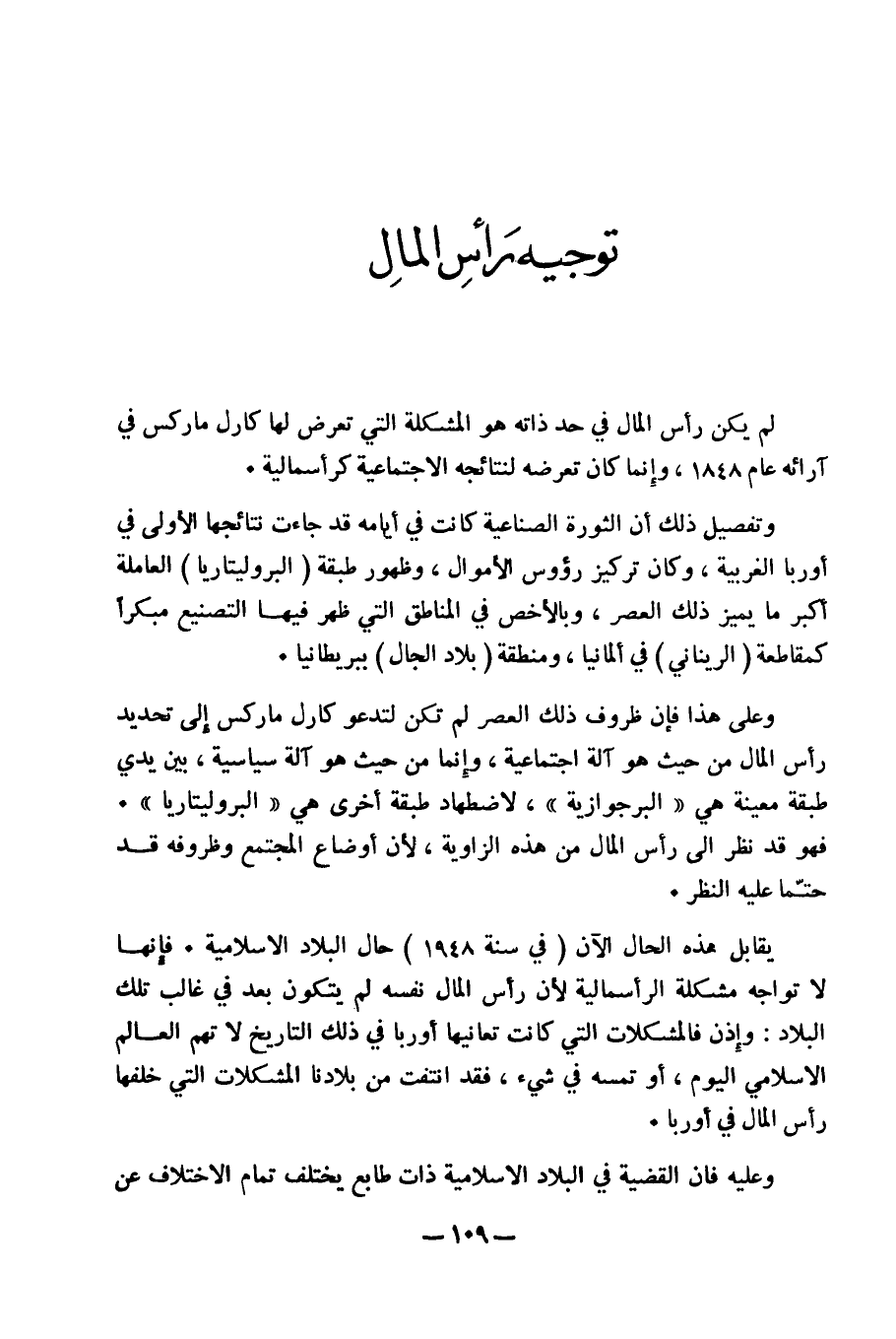 يقابل هذه الحال الآن (في سنة 1948) حال البلاد الإسلامية. فإنها لا تواجه مشكلة الرأسمالية لأن رأس المال نفسه لم يتكون بعد في غالب تلك البلاد: وإذن فالمشكلات التي كانت تعانيها أوربا في ذلك التاريخ لا تهم العالم الاسلامي اليوم، أو تمسه في شيء، فقد انتفت من بلادنا المشكلات التي خلفها رأس المال في أوربا.