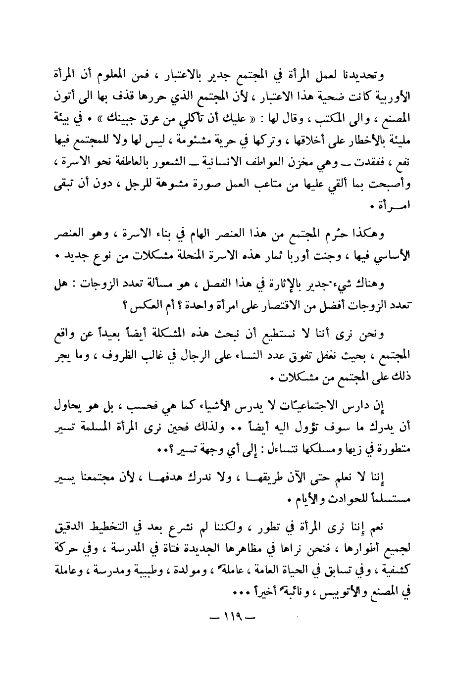 نعم إننا نرى المرأة في تطور، ولكننا لم نشرع بعد في التخطيط الدقيق لجميع أطوارها، فنحن نراها في مظاهرها الجديدة فتاة في المدرسة، وفي حركة كشفية، وفي تسابق في الحياة العامة، عاملةً، ومولدة، وطبيبة ومدرسة، وعاملة في المصنع والأتوبيس، ونائبةً أخيراً ...