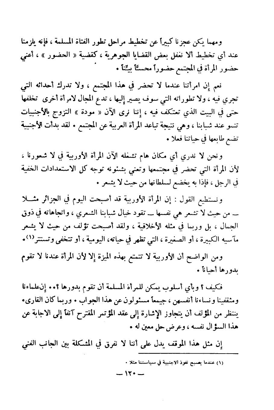 ونستطيع القول: إن المرأة الأوربية قد أصبحت اليوم في الجزائر مثلا -من حيث لا تشعر هي نفسها- تقود خيال شبابنا الشعري، واتجاهاته في ذوق الجمال، بل وربما في مثله الأخلاقية، ولقد أصبحت تؤلف من حيث لا يشعر مآسيه الكبيرة، أو الصغيرة، التي تظهر في حياته، اليومية، أو تتخفى وتستتر (1). ومن الواضح أن الأوربية لا تتمتع بهذه الميزة إِلا لأن المرأة عندنا لا تقوم بدورها أحيانا.