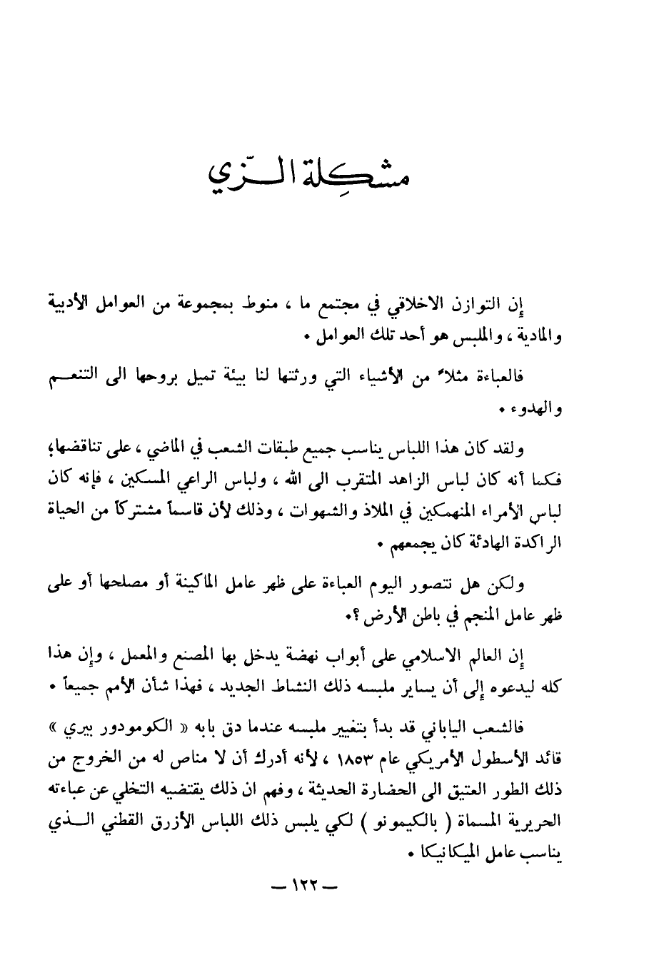 إن العالم الاسلامي على أبواب نهضة يدخل بها المصنع والعمل، وإن هذا كله ليدعوه إلى أن يساير ملبسه ذلك النشاط الجديد، فهذا شأن الأمم جميعاً. فالشعب الياباني قد بدأ بتغيير ملبسه عندما دق بابه ((الكومودور بيري))، قائد الأسطول الأمريكي عام 1853، لأنه أدرك أن لا مناص له من الخروج من ذلك الطور العتيق إلى الحضارة الحديثة، وفهم أن ذلك يقتضيه التخلي عن عباءته الحريرية المسماة (بالكيمونو) لكي يلبس ذلك اللباس الأزرق القطني الذي يناسب عامل الميكانيكا.
