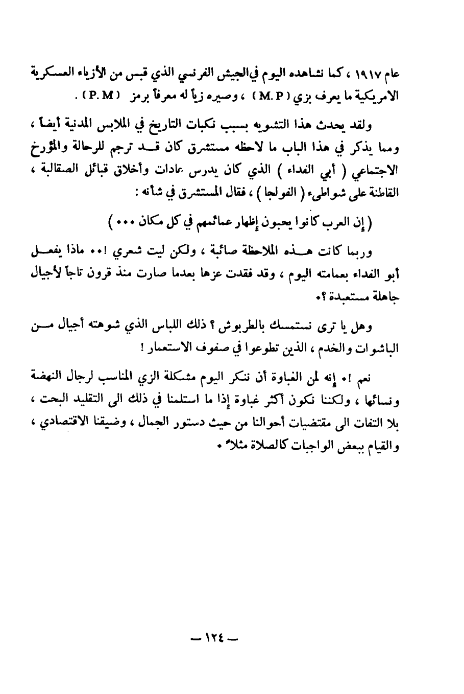 نعم!. إنه لمن الغباوة أن ننكر اليوم مشكلة الزي المناسب لرجال النهضة ونسائها، ولكننا نكون أكثر غباوة إذا ما استلمنا في ذلك إلى التقليد البحت، بلا التفات إلى مقتضيات أحوالنا من حيث دستور الجمال، وضيقنا الاقتصادي، والقيام ببعض الواجبات كالصلاة مثلاً.