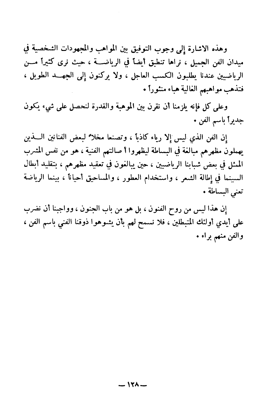 إن الفن الذي ليس إلا رياء كاذباً، وتصنعاً مخلاً لبعض الفنانين الذين يهملون مظهرهم مبالغة في البساطة ليظهروا أصالتهم الفنية، هو من نفس المشرب الممثل في بعض شبابنا الرياضيين، حين يبالغون في تعقيد مظهرهم، بتقليد أبطال السينما في إِطالة الشعر، واستخدام العطور، والمساحيق أحيانا، بينما الرياضة تعني البساطة.
