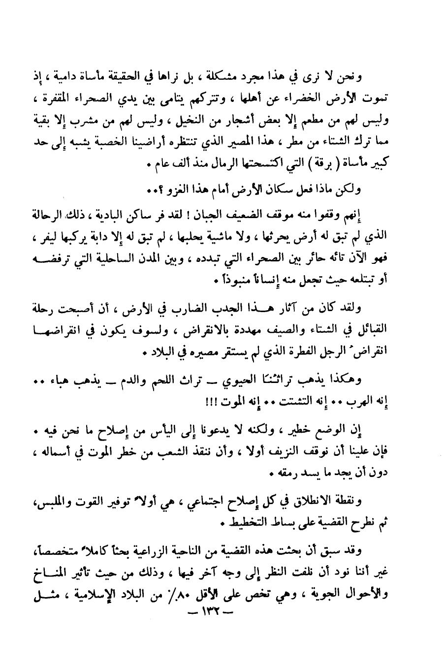 ونحن لا نرى في هذا مجرد مشكلة، بل نراها في الحقيقة مأساة دامية، إذ تموت الأرض الخضراء عن أهلها، وتتركهم يتامى بين يدي الصحراء المقفرة، وليس لهم من مطعم إلا بعض أشجار من النخيل، وليس لهم من مشرب إلا بقية مما ترك الشتاء من مطر، هذا المصير الذي تنتظره أراضينا الخصبة يشبه إلى حد كبير مأساة (برقة) التي اكتسحتها الرمال منذ ألف عام.