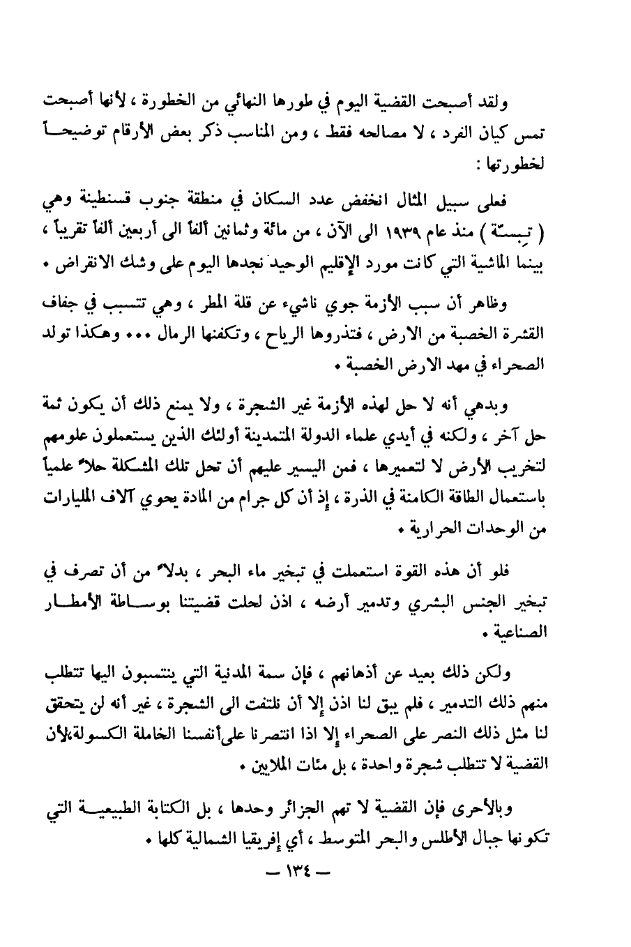 ولكن ذلك بعيد عن أذهانهم، فإن سمة المدنية التي ينتسبون إليها تتطلب منهم ذلك التدمير، فلم يبق لنا إذن إلا أن نلتفت إلى الشجرة، غير أنه لن يتحقق لنا مثل ذلك النصر على الصحراء إلا اذا انتصرنا على أنفسنا الخاملة الكسولة، لأن القضية لا تتطلب شجرة واحدة، بل مئات الملايين.