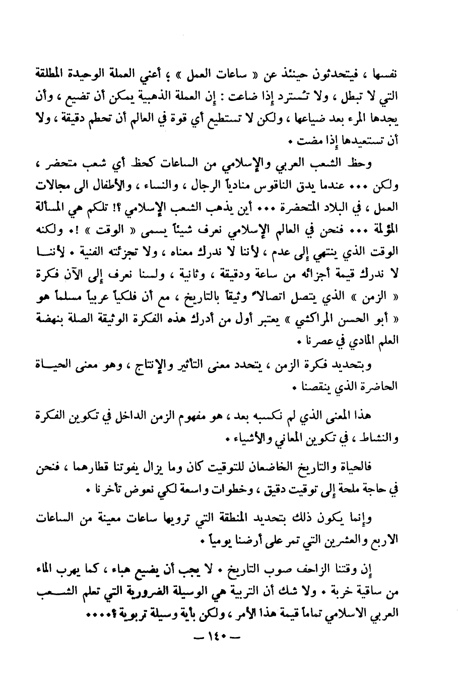 وحظ الشعب العربي والإسلامي من الساعات كحظ أي شعب متحضر، ولكن ... عندما يدق الناقوس مناديا الرجال، والنساء، والأطفال إلى مجالات العمل، في البلاد المتحضرة ... أين يذهب الشعب الإسلامي؟! تلكم هي المسألة المؤلمة ... فنحن في العالم الإسلامي نعرف شيئاً يسمى "الوقت"!. ولكنه الوقت الذي ينتهي إلى عدم، لأننا لا ندرك معناه، ولا تجزئته الفنية. لأننا لا ندرك قيمة أجزائه من ساعة ودقيقة، وثانية، ولسنا نعرف إلى الآن فكرة "الزمن" الذي يتصل اتصالاً وثيقا بالتاريخ، مع أن فلكيا عربيا مسلما هو ((أبو الحسن المراكشي)) يعتبر أول من أدرك هذه الفكرة الوثيقة الصلة بنهضة العلم المادي في عصرنا.
