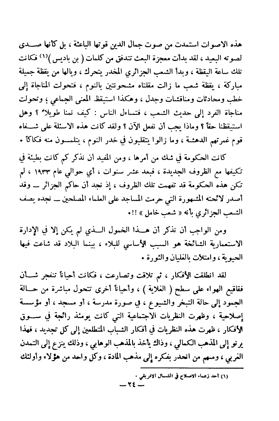 هذه الأصوات استمدت من صوت جمال الدين قوتها الباعثة، بل كأنها صدى لصوته البعيد، لقد بدأت معجزة البعث تتدفق من كلمات (بن باديس) (1) فكانت تلك ساعة اليقظة، وبدأ الشعب الجزائري المخدر يتحرك، ويا لها من يقظة جميلة مباركة، يقظة شعب ما زالت مقلتاه مشحونتين بالنوم، فتحولت المناجاة إلى خطب ومحادثات ومناقشات وجدل، وهكذا استيقظ المعنى الجماعي؛ وتحولت مناجاة الفرد إلى حديث الشعب، فتساءل الناس: كيف نمنا طويلاً؟ وهل استيقظنا حقا؟ وماذا يجب أن نفعل الآن! ولقد كانت هذه الأسئلة على شفاه قوم غمرتهم الدهشة، وما زالوا يتقلبون في خدر النوم، يتلمسون منه فكاكا.