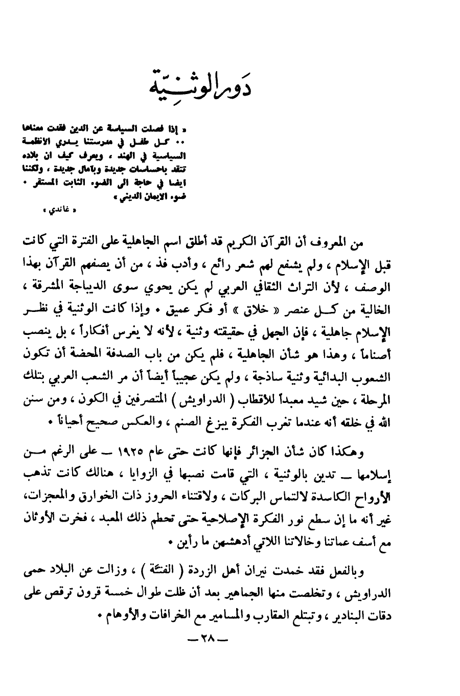 وهكذا كان شأن الجزائر فإنها كانت حتى عام 1925 - على الرغم من إسلامها- تدين بالوثنية، التي قامت نصبها في الزوايا، هنالك كانت تذهب الارواح الكاسدة لالتماس البركات، ولاقتناء الحروز ذات الخوارق والمعجزات، غير أنه ما إن سطع نور الفكرة الإصلاحية حتى تحطم ذلك المعبد، فخرت الأوثان مع أسف عماتنا وخالاتنا اللاتي أدهشهن ما رأين.