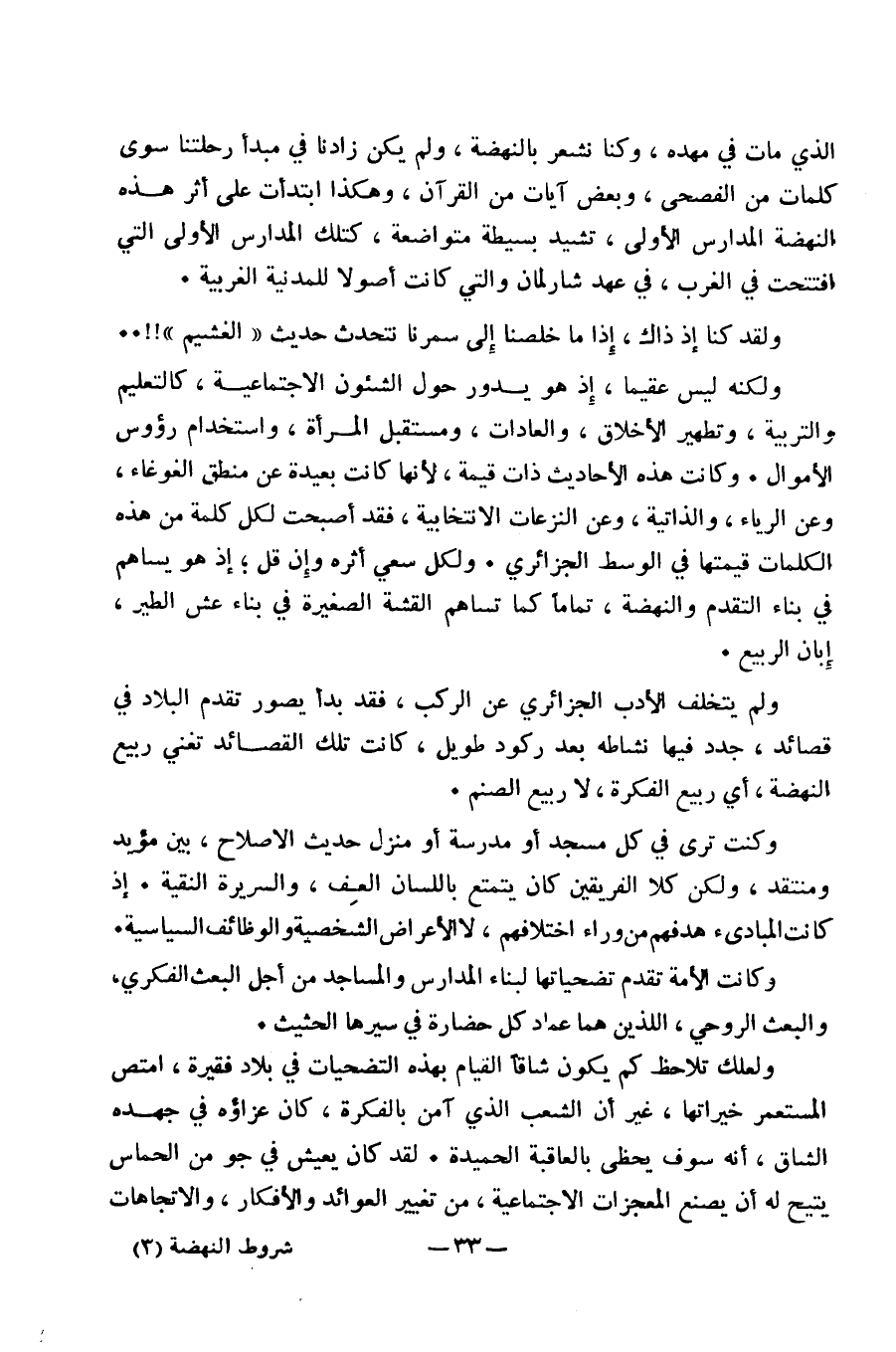 والتربية، وتطهير الأخلاق، والعادات، ومستقبل المرأة، واستخدام رؤوس الأموال. وكانت هذه الأحاديث ذات قيمة، لأنها كانت بعيدة عن منطق الغوغاء، وعن الرياء، والذاتية، وعن النزعات الانتخابية، فقد أصبحت لكل كلمة من هذه الكلمات قيمتها في الوسط الجزائري. ولكل سعي أثره وإن قل؛ إذ هو يساهم في بناء التقدم والنهضة، تماما كما تساهم القشة الصغيرة في بناء عش الطير، إبان الربيع.