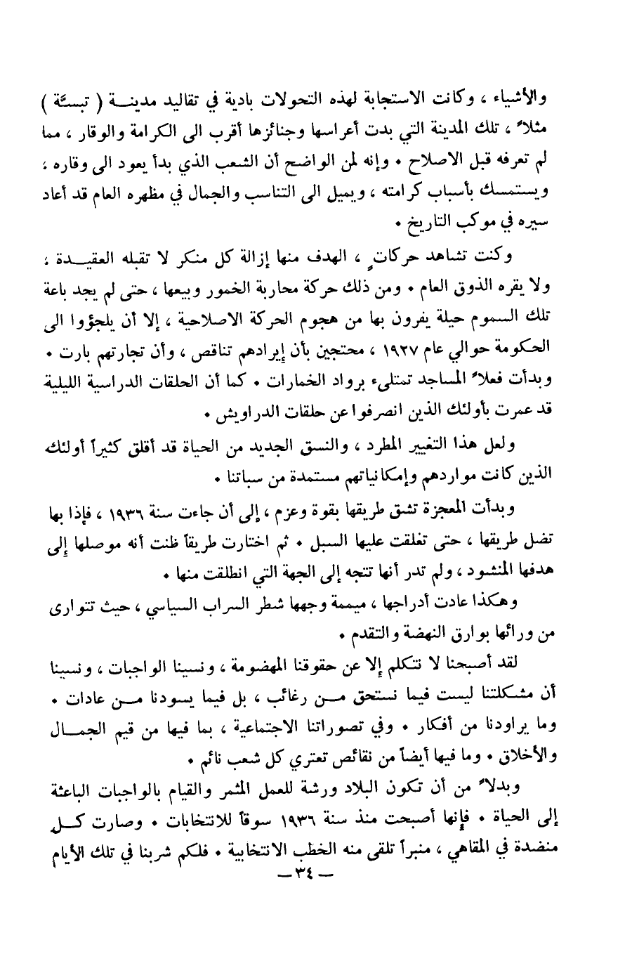 ولا يقره الذوق العام. ومن ذلك حركة محاربة الخمور وبيعها، حتى لم يجد باعة تلك السموم حيلة يفرون بها من هجوم الحركة الاصلاحية، إلا أن يلجؤوا إلى الحكومة حوالي عام 1927، محتجين بأن إيرادهم تناقص، وأن تجارتهم بارت. وبدأت فعلاً المساجد تمتلئ برواد الخمارات. كما أن الحلقات الدراسية الليلية قد عمرت بأولئك الذين انصرفوا عن حلقات الدراويش.