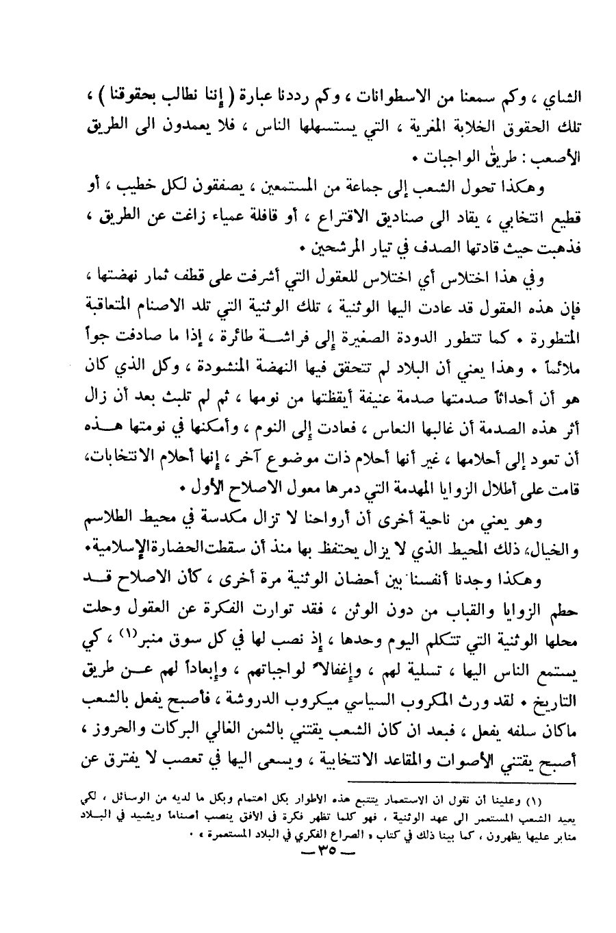 وفي هذا اختلاس أي اختلاس للعقول التي أشرفت على قطف ثمار نهضتها، فإن هذه العقول قد عادت إليها الوثنية، تلك الوثنية التي تلد الاصنام المتعاقبة المتطورة. كما تتطور الدودة الصغيرة إلى فراشة طائرة، إذا ما صادفت جوا ملائماً. وهذا يعني أن البلاد لم تتحقق فيها النهضة المنشودة، وكل الذي كان هو أن أحداثا صدمتها صدمة عنيفة أيقظتها من نومها، ثم لم تلبث بعد أن زال أثر هذه الصدمة أن غالبها النعاس، فعادت إلى النوم، وأمكنها في نومتها هذه أن تعود إلى أحلامها، غير أنها أحلام ذات موضوع آخر، إنها أحلام الانتخابات، قامت على أطلال الزوايا المهدمة التي دمرها معول الاصلاح الأول.