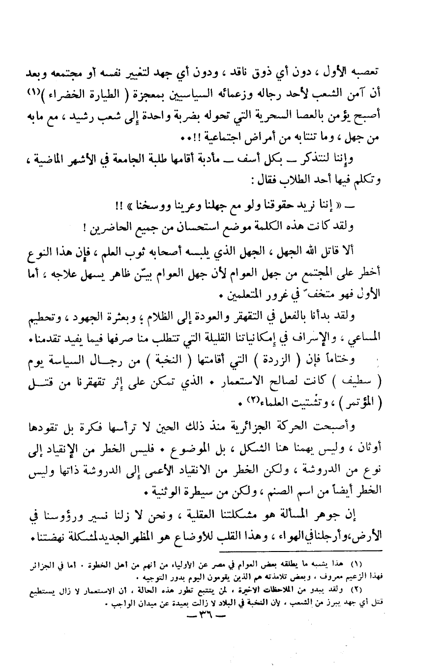 (2) ولقد يبدو من الملاحظات الأخيرة، لمن يتتبع تطور هذه الحالة، أن الاستعمار لا زال يستطيع قتل أي جهد ببرز من الشعب، لأن النخبة في البلاد لا زالت بعيدة عن ميدان الواجب.