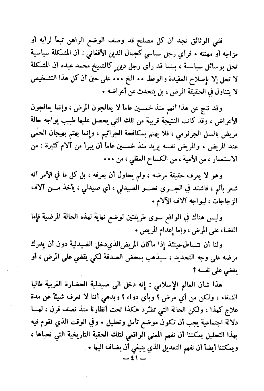 ففي الوثائق نجد أن كل مصلح قد وصف الوضع الراهن تبعا لرأيه أو مزاجه أو مهنته. فرأي رجل سياسي كجمال الدين الأفغاني: أن المشكلة سياسية تحل بوسائل سياسية، بينما قد رأى رجل دينٍ كالشيخ محمد عبده أن المشكلة لا تحل إلا بإصلاح العقيدة والوعظ .. الخ ... على حين أن كل هذا التشخيص لا يتنناول في الحقيقة المرض، بل يتحدث عن أعراضه.