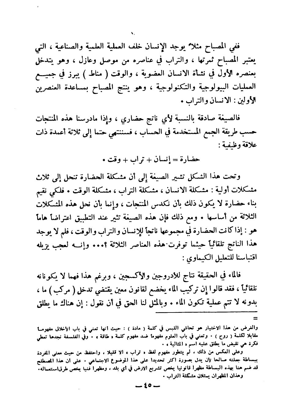 وتحت هذا الشكل تشير الصيغة إِلى أن مشكلة الحضارة تنحل إلى ثلاث مشكلات أولية: مشاكلة الإنسان، مشكلة التراب، مشكلة الوقت. فلكي نقيم بناء حضارة لا يكون ذلك بأن نكدس المنتجات، وإنما بأن نحل هذه المشكلات الثلاثة من أساسها. ومع ذلك فإن هذه الصيغة تثير عند التطبيق اعتراضا هاما هو: إذا كانت الحضارة في مجموعها ناتجا للإنسان والتراب والوقت، فلم لا يوجد هذا الناتج تلقائيا حيثما توفرت- هذه العناصر الثلاثة؟ ... وإنه لعجب يزيله اقتباسنا للتحليل الكيماوي:
