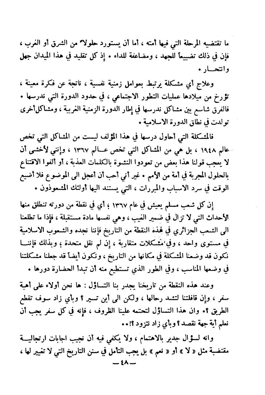 إن كل شعب مسلم يعيش في عام 1367، أي في نقطة من دورته تنطلق منها الأحداث التي لا تزال في ضمير الغيب، وهي نفسها مادة مستقبلة، فإذا ما تطلعنا إلى الشعب الجزائري في هذة النقطة من التاريخ فإننا نجده والشعوب الإسلامية في مستوى واحد، وفي مشكلات متقاربة، إن لم نقل متحدة؛ وبذلك فإننا نكون قد وضعنا المشكلة في مكانها من التاريخ، ونكون أيضا قد جعلنا مشكلتنا في وضعها المناسب، وفي الطور الذي تستطيع منه أن تبدأ الحضارة دورها.