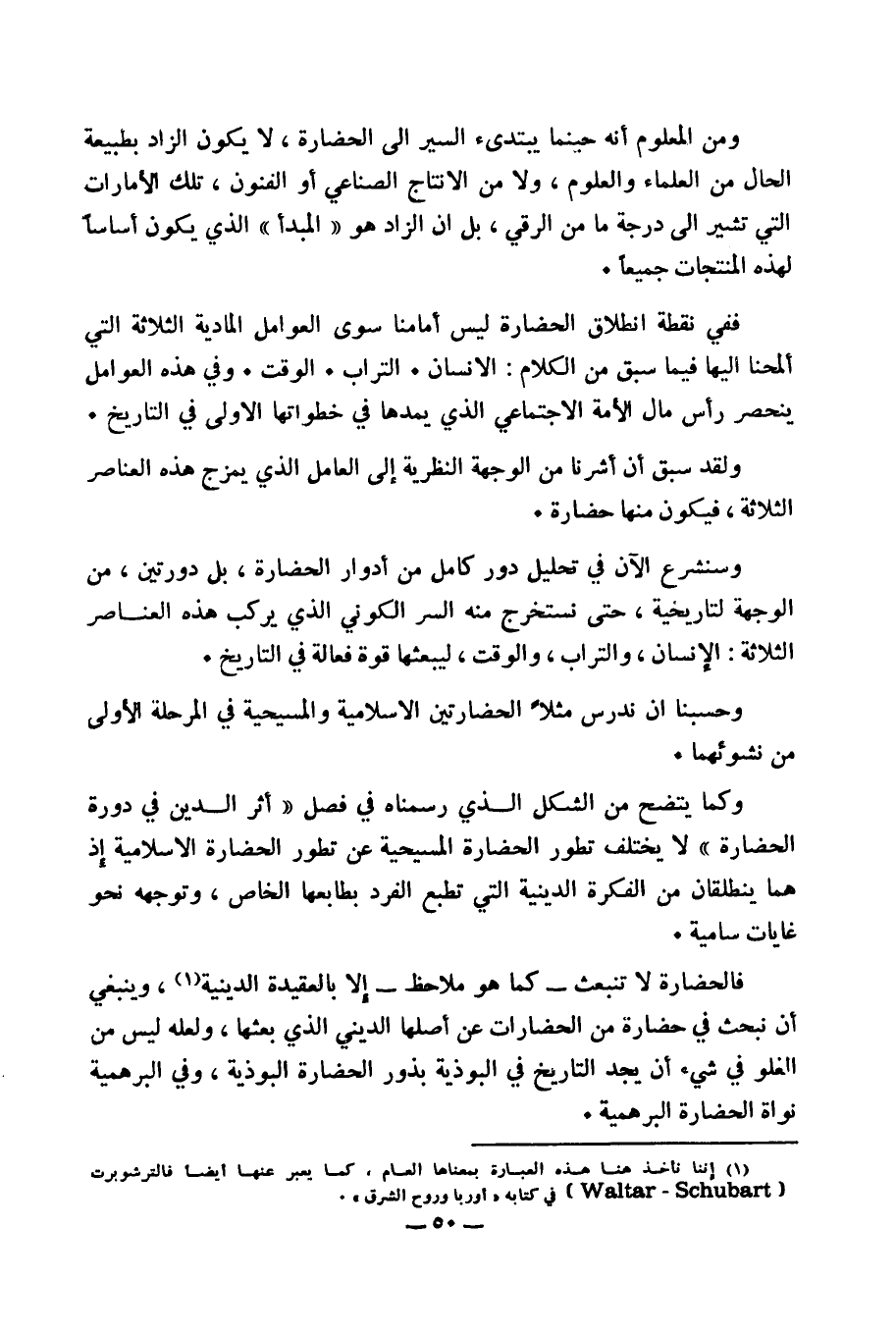 ومن المعلوم أنه حينما يبتدىء السير إلى الحضارة، لا يكون الزاد بطبيعة الحال من العلماء والعلوم، ولا من الانتاج الصناعي أو الفنون، تلك الأمارات التي تشير إلى درجة ما من الرقي، بل إن الزاد هو "المبدأ" الذي يكون أساسا لهذه المنتجات جميعا.