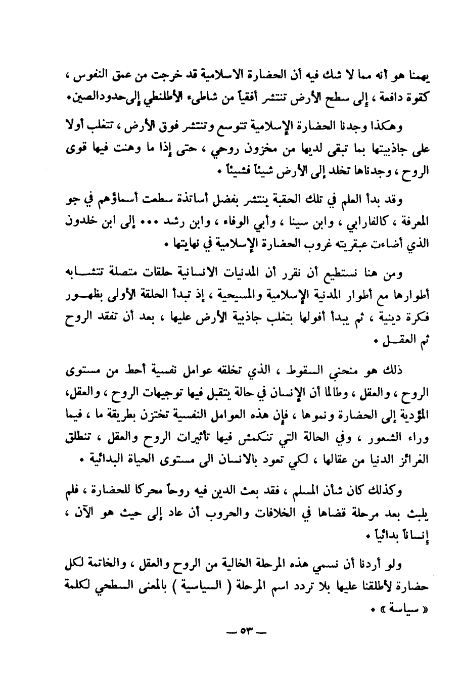 ومن هنا نستطيع أن نقرر أن المدنيات الإنسانية حلقات متصلة تتشابه أطوارها مع أطوار المدنية الإسلامية والمسيحية، إذ تبدأ الحلقة الأولى بظهور فكرة دينية، ثم يبدأ أفولها بتغلب جاذبية الأرض عليها، بعد أن تفقد الروح ثم العقل.