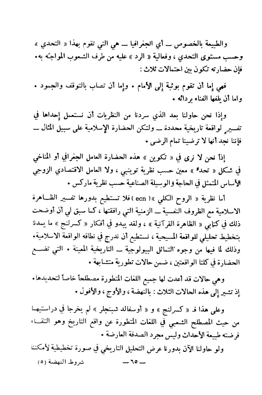 أما نظرية "الروح الكلي" ( ecn) فلا تستطيع بدورها تفسير الظاهرة الإسلامية مع الظروف النفسية- الزمنية التي رافقتها، كما سبق لي أن أوضحت ذلك في كتابي "الظاهرة القرآنية"، ولقد يبدو في أفكار ((كسرلنج)) ما يمدنا بتخطيط تحليلي للواقعة المسيحية، نستطيع أن ندرج في نطاقه الواقعة الاسلامية.