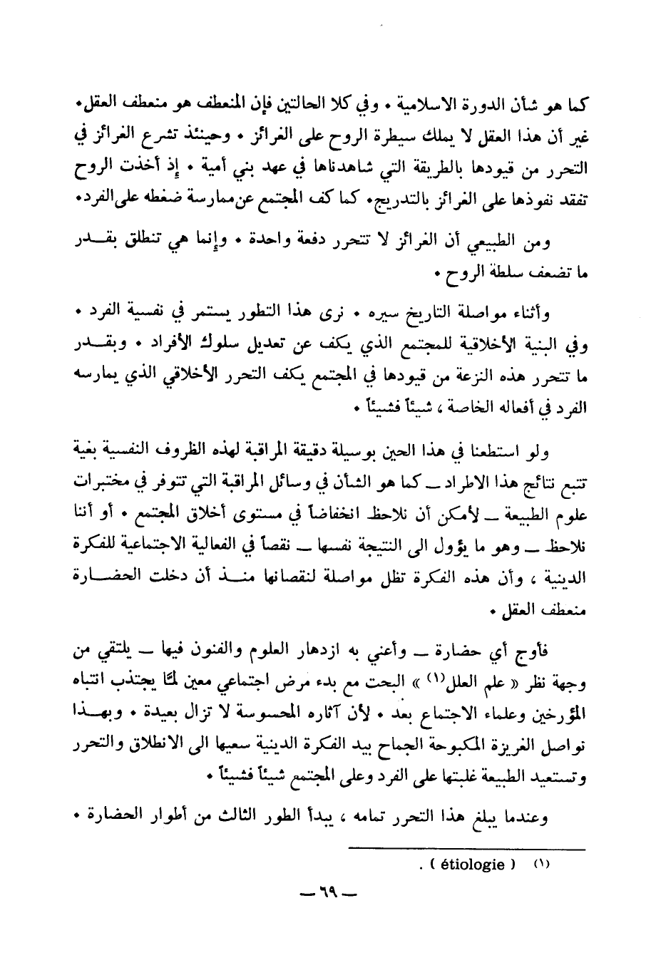 فأوج أي حضارة- وأعني به ازدهار العلوم والفنون فيها- يلتقي من وجهة نظر "علم العلل (1) " البحت مع بدء مرض اجتماعي معين لمِّا يجتذب انتباه المؤرخين وعلماء الاجتماع بعد. لأن آثاره المحسوسة لا تزال بعيدة. وبهذا نواصل الغريزة المكبوحة الجماح بيد الفكرة الدينية سعيها إلى الانطلاق والتحرر وتستعيد الطبيعة غلبتها على الفرد وعلى المجتمع شيئا فشيئا.