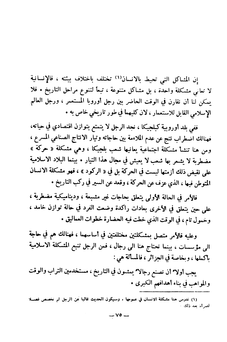 إن المشاكل التي تحيط بالإنسان (1) تختلف باختلاف بيئته، فالإنسانية لا تعاني مشكلة واحدة، بل مشاكل متنوعة، تبعا لتنوع مراحل التاريخ. فلا يمكن لنا أن نقارن في الوقت الحاضر بين رجل أوروبا المستعمر، ورجل العالم الإسلامي القابل للاستعمار، لأن كليهما في طور تاريخي خاص به.