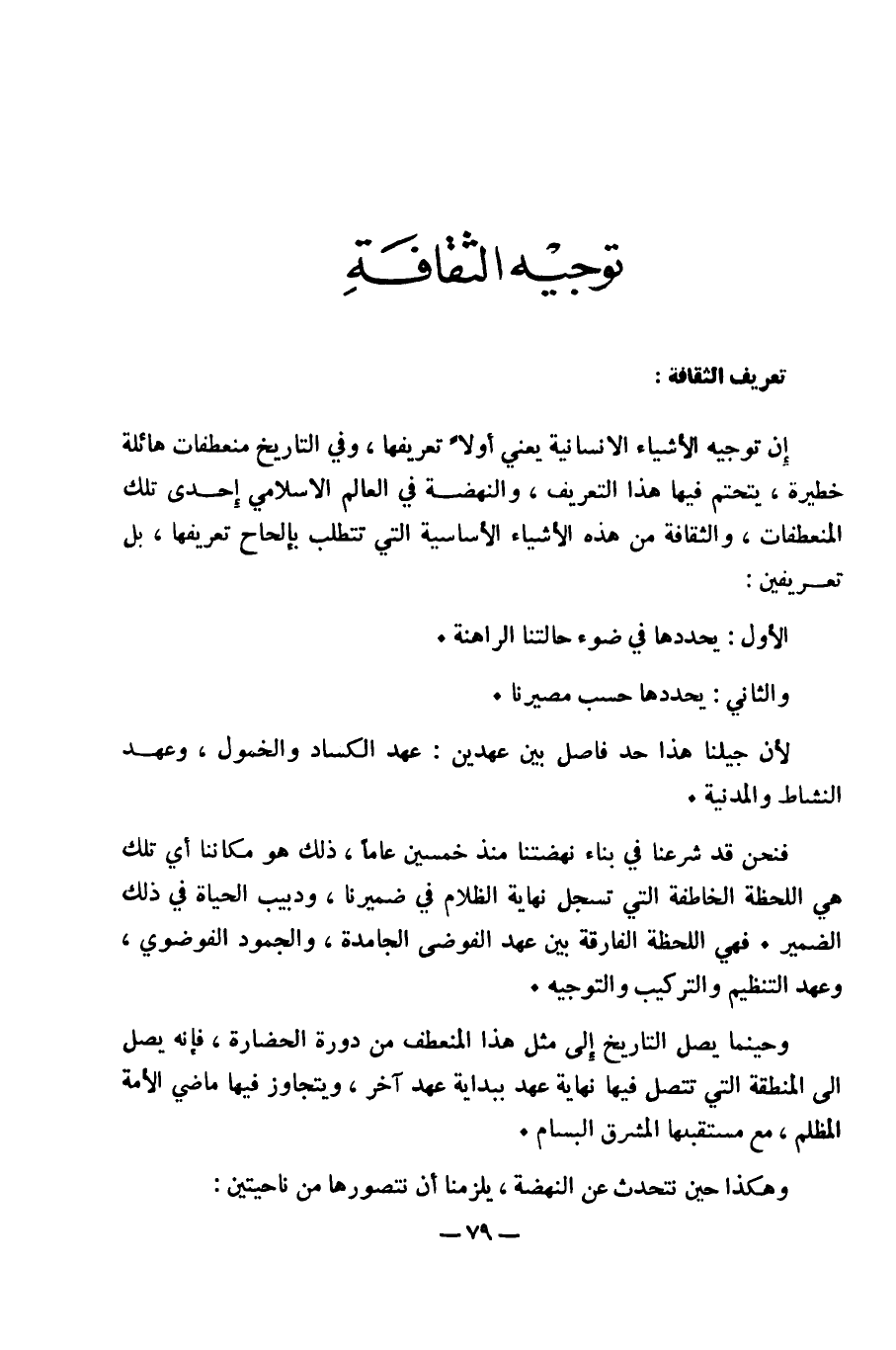 إن توجيه الأشياء الإنسانية يعني أولاً تعريفها، وفي التاريخ منعطفات هائلة خطيرة، يتحتم فيها هذا التعريف، والنهضة في العالم الاسلامي إحدى تلك المنعطفات، والثقافة من هذه الأشياء الأساسية التي تتطلب بإلحاح تعريفها، بل تعريفين: