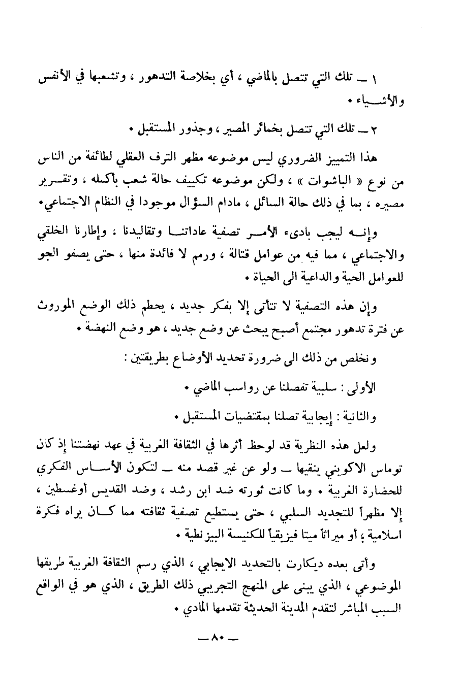 وإن هذه التصفية لا تتأتى إلا بفكر جديد، يحطم ذلك الوضع الموروث عن فترة تدهور مجتمع أصبح يبحث عن وضع جديد، هو وضع النهضة. ونخلص من ذلك إلى ضرورة تحديد الأوضاع بطريقتين: