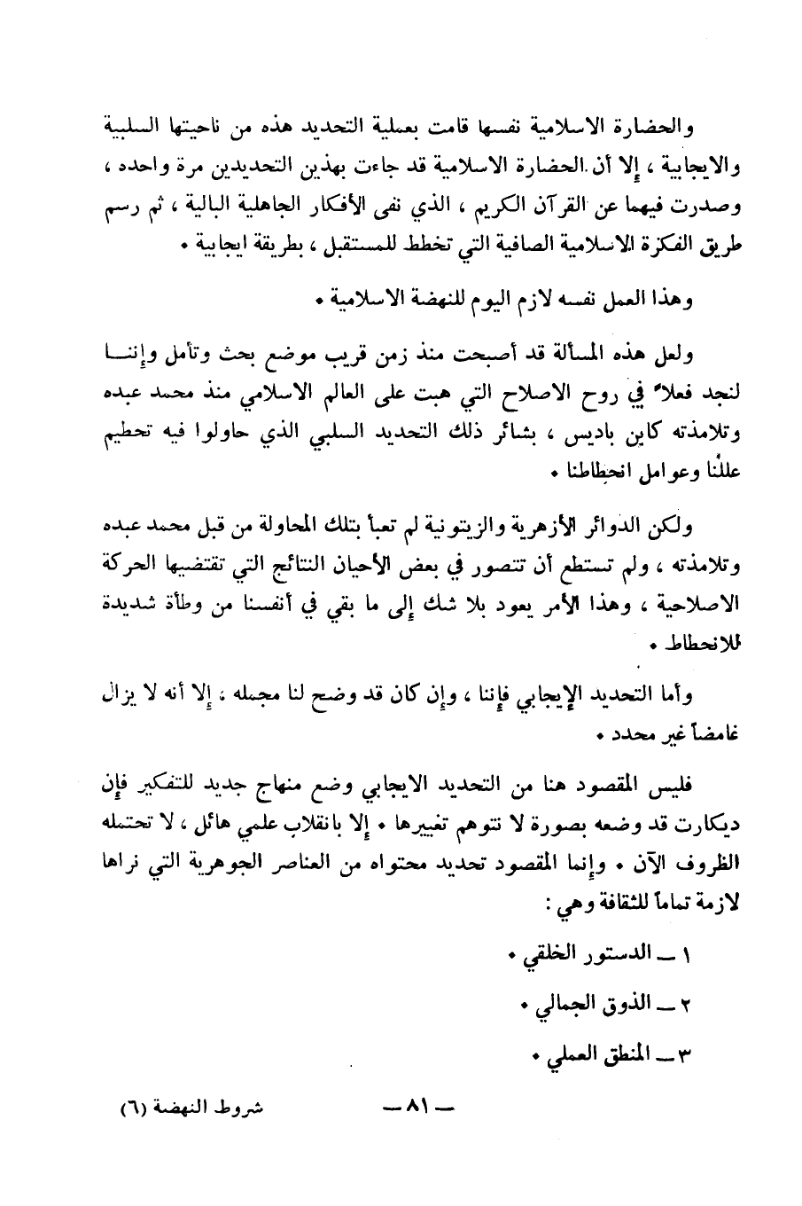 ولعل هذه المسألة قد أصبحت منذ زمن قريب موضع بحث وتأمل وإننا لنجد فعلاً في روح الاصلاح التي هبت على العالم الاسلامي منذ محمد عبده وتلامذته كابن باديس، بشائر ذلك التحديد السلبي الذي حاولوا فيه تحطيم عللنا وعوامل انحطاطنا.