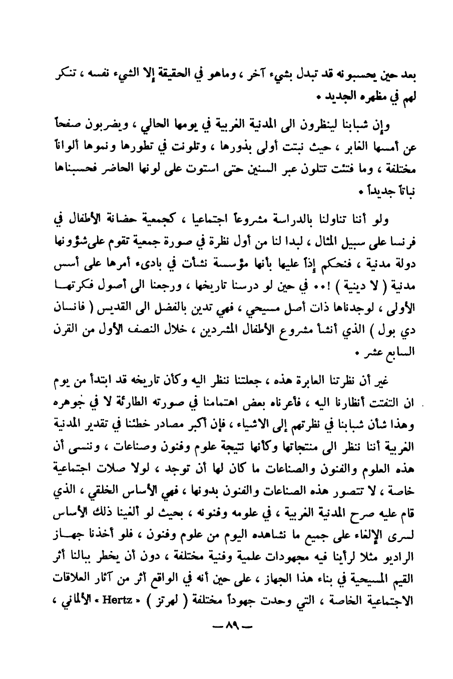 غير أن نظرتنا العابرة هذه، جعلتنا ننظر إليه وكان تاريخه قد ابتدأ من يوم ان التفتت أنظارنا اليه، فاعرناه بعض اهتمامنا في صورته الطارئة لا في جوهره وهذا شان شبابنا في نظرتهم إلى الأشياء، فإن أكبر مصادر خطئنا في تقدير المدنية الغربية أننا ننظر إلى منتجاتها وكأنها نتيجة علوم وفنون وصناعات، وننسى أن هذه العلوم والفنون والصناعات ما كان لها أن توجد، لولا صلات اجتماعية خاصة، لا تتصور هذه الصناعات والفنون بدونها، فى الأساس الخلقي، الذي قام عليه صرح المدنية الغربية، في علومه وفنونه، بحيث لو ألغينا ذلك الأساس لسرى الإلغاء على جميع ما نشاهده اليوم من علوم وفنون، فلو أخذنا جهاز الراديو مثلا لرأينا فيه مجهودات علمية وفنية مختلفة، دون أن يخطر ببالنا أثر القيم المسيحية في بناء هذا الجهاز، على حين أنه في الواقع أثر من آثار العلاقات الاجتماعية الخاصة، التي وحدت جهودا مختلفة (لهرتز) " Hertz" الألماني،