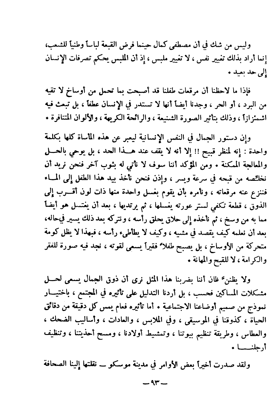 وإن دستور الجمال في النفس الإنسانية ليعبر عن هذه المأساة كلها بكلمة واحدة: إنه لمنظر قبيح!! إلا أنه لا يقف عند هذا الحد، بل يوحي بالحل والمعالجة الممكنة. ومن المؤكد أننا سوف لا نأتي له بثوب آخر فنحن نريد أن نخلِّصه من قبحه في سرعة ويسر، وإِذن فنحن نأخذ بيد هذا الطفل إلى الماء فننزع عنه مرقعاته، ونأمره بأن يقوم بغسل واحدة منها ذات لون أقرب إلى الذوق، قطعة تكفي لستر عورته يغسلها، ثم يرتديها، بعد أن يغتسل هو أيضا مما به من وسخ، ثم نأخذه إلى حلاق يحلق رأسه، ونتركه بعد ذلك يسير في حاله، بعد أن نعلمه كيف يقصد في مشيه، وكيف لا يطأطىء رأسه، فبهذا لا يظل كومة متحركة من الأوساخ، بل يصبح طفلاً فقيرا يسعى لقوته، نجد فيه صورة للفقر والكرامة، لا للقبح والمهانة.