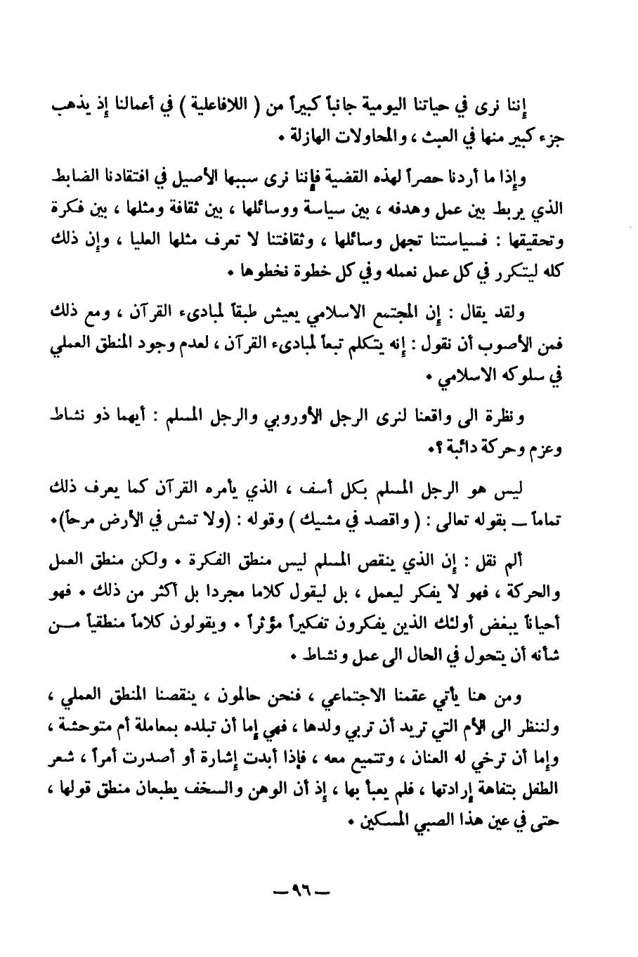 ليس هو الرجل المسلم بكل أسف، الذي يأمره القرآن كما يعرف ذلك تماما- بقوله تعالى: (واقصد في مشيك) وقوله: (ولا تمش في الأرض مرحا). ألم نقل: إن الذي ينقص المسلم ليس منطق الفكر؟. ولكن منطق العمل والحركة، فهو لا يفكر ليعمل، بل ليقول كلاما مجردا بل أكثر من ذلك. فهو أحيانا يبغض أولئك الذين يفكرون تفكيرا مؤثرا. ويقولون كلاما منطقيا من شأنه أن يتحول في الحال إلى عمل ونشاط.