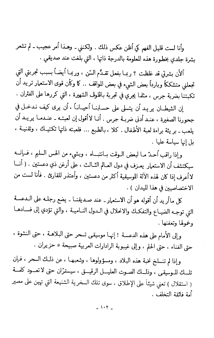 وإذا لم تنسلخ نخبة هذه البلاد، ومسؤولوها، وشعبها، عن ذلك السحر، فإن تلك الموسيقى، وذلك الصوت العليل الرقيق، سيستمران حتى لا تعود كلمة (استقلال) تعني شيئا على الإطلاق، سوى تلك السخرية الشنيعة التي تهيمن على مصير أمة فائقة التخلف.