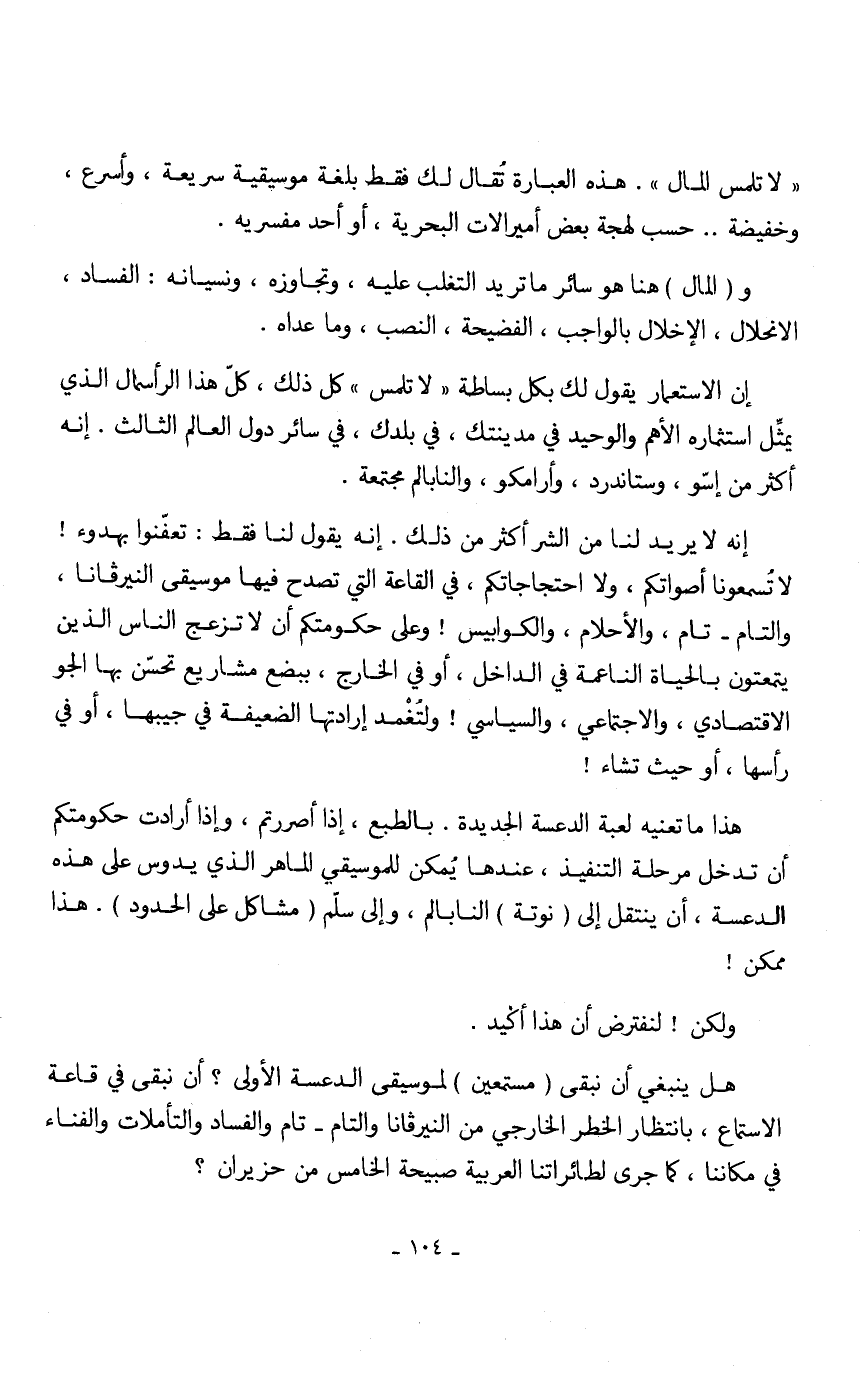 إنه لا يريد لنا من الشر أكثر من ذلك. إنه يقول لنا فقط: تعفنوا بهدوء! لا تسمعونا أصواتكم، ولا احتجاجاتكم، في القاعة التي تصدح فيها موسيقى النيرفانا، والتام- تام، والأحلام، والكوابيس! وعلى حكومتكم أن لا تزعج الناس الذين يتمتعون بالحياة الناعمة في الداخل، أو في الخارج، ببضع مشاريع تحسن بها الجو الاقتصادي، والاجتماعي، والسياسي! ولتغمد إرادتها الضعيفة في جيبها، أو في رأسها، أو حيث تشاء!