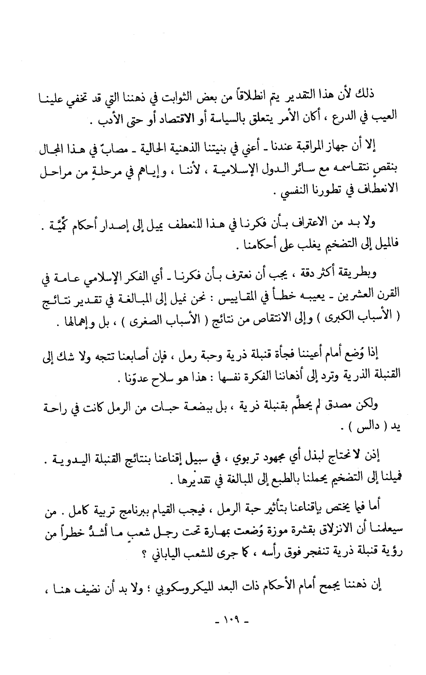 وبطريقة أكثر دقة، يجب أن نعترف بأن فكرنا - أي الفكر الإسلامي عامة في القرن العشرين- يعيبه خطأ في المقاييس: نحن نميل إلى المبالغة في تقدير نتائج (الأسباب الكبرى) وإلى الانتقاص من نتائج (الأسباب الصغرى)، بل وإهمالها.