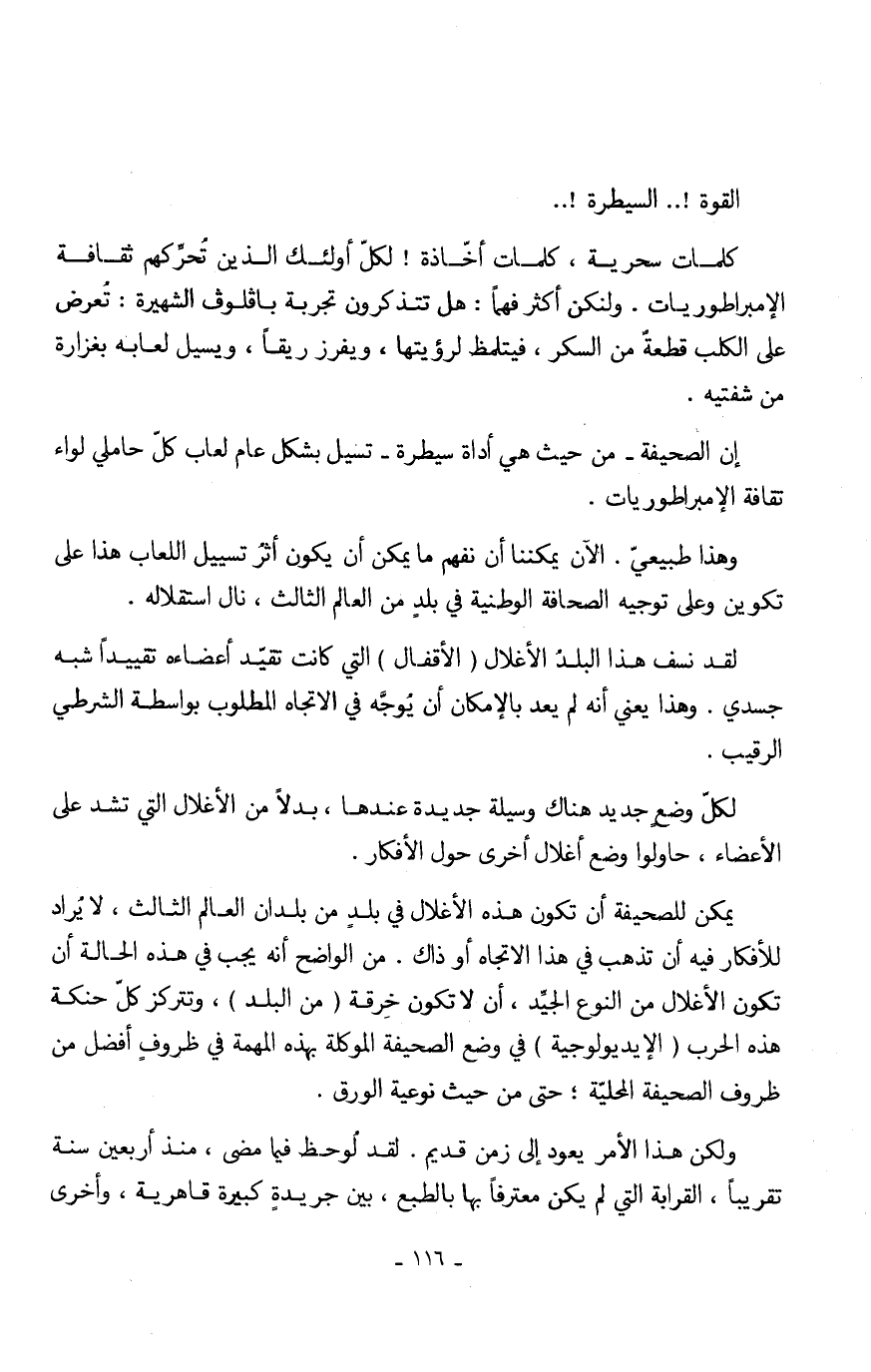 إن الصحيفة- من حيث هي أداة سيطرة- تسيل بشكل عام لعاب كل حاملي لواء ثقافة الإمبراطوريات.