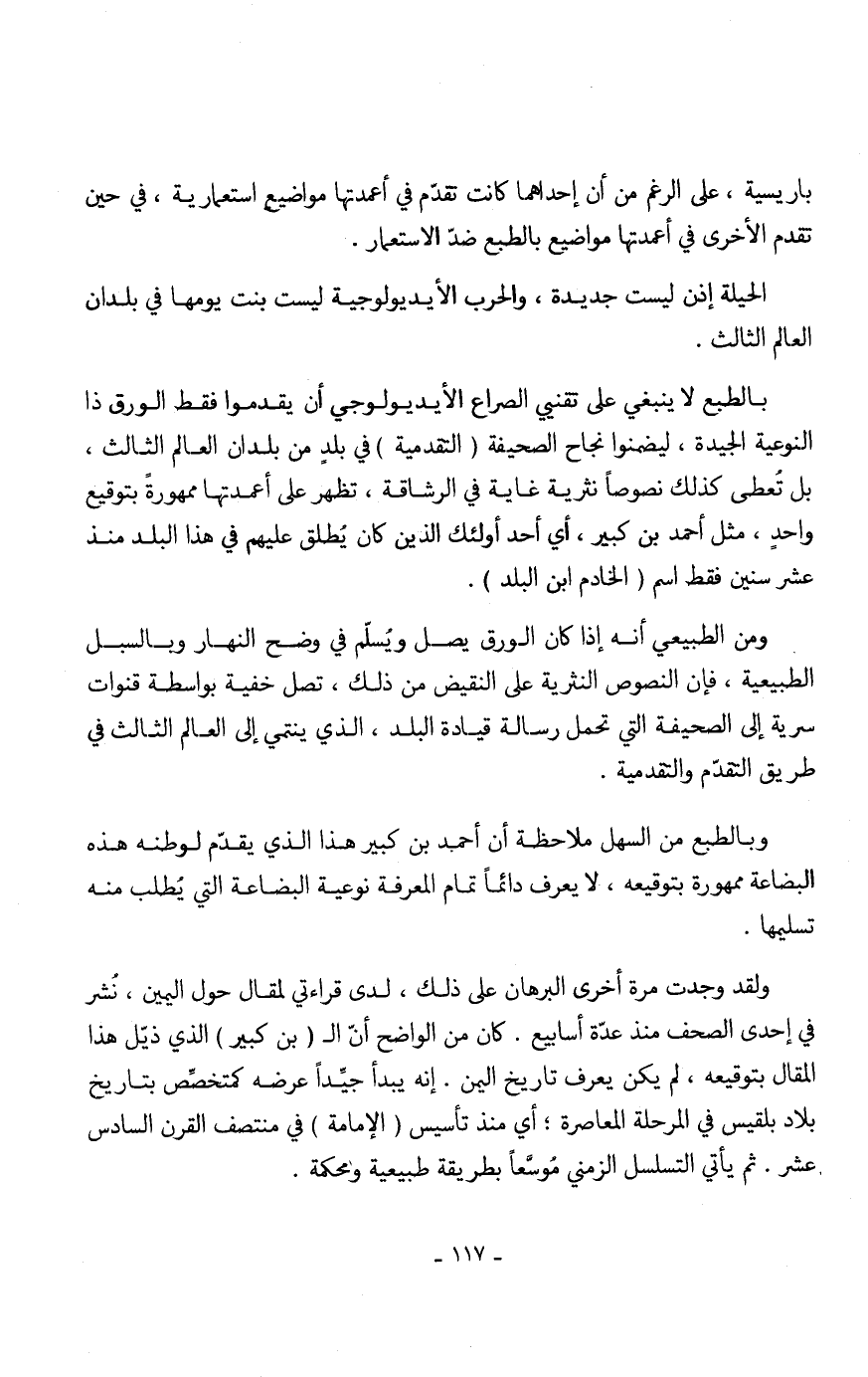 بالطبع لا ينبغي على تقنيي الصراع الأيديولوجي أن يقدموا فقط الورق ذا النوعية الجيدة، ليضمنوا نجاح الصحيفة (التقدمية) في بلد من بلدان العالم الثالث، بل تعطى كذلك نصوصا نثرية غاية في الرشاقة، تظهر على أعمدتها ممهورة بتوقيع واحد، مثل أحمد بن كبير، أي أحد أولئك الذين كان يطلق عليهم في هذا البلد منذ عشر سنين فقط اسم (الخادم ابن البلد).
