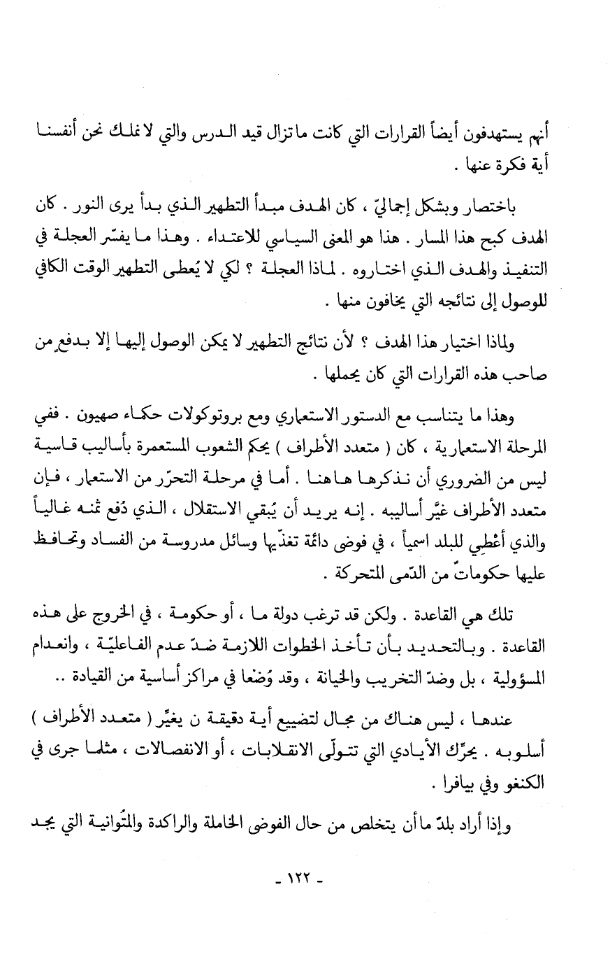 وهذا ما يتناسب مع الدستور الاستعماري ومع بروتوكولات حكماء صهيون. ففي المرحلة الاستعمارية، كان (متعدد الأطراف) يحكم الشعوب المستعمرة بأساليب قاسية ليس من الضروري أن نذكرها هاهنا. أما في مرحلة التحرر من الاستعمار، فإن متعدد الأطراف غير أساليبه. إنه يريد أن يبقي الاستقلال، الذي دفع ثمنه غاليا والذي أعطي للبلد اسميا، في فوضى دائمة تغذيها وسائل مدروسة من الفساد وتحافظ علمها حكومات من الدمى المتحركة.