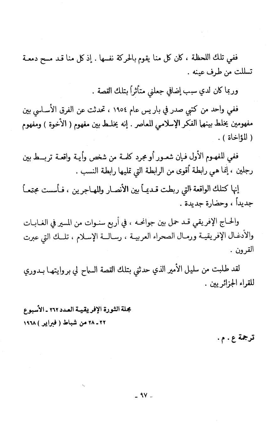 ففي واحد من كتبي صدر في باريس عام 1954، تحدثت عن الفرق الأساسي بين مفهومين يخلط بينهما الفكر الإسلامي المعاصر. إنه يخلط بين مفهوم (الأخوة) ومفهوم (المؤاخاة).