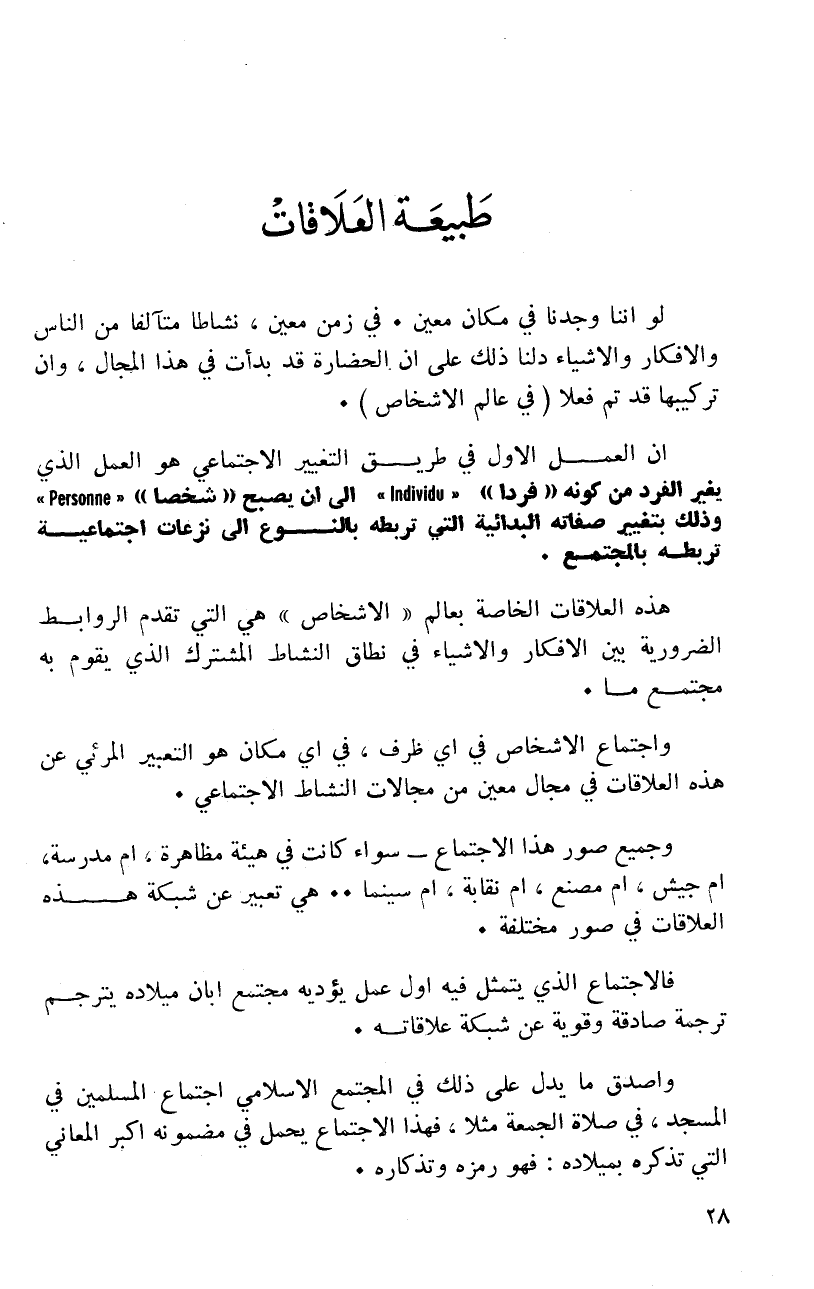 هذه العلاقة العضوية التاريخية الأساسية تتجلى في كل عنصر من عناصر المجتمع الثلاثة لتؤكد وحدة تأثيره منفرداً، كما تتجلى في علاقاته بالعنصرين الآخرين لتؤكد وحدة تأثيرها مجتمعة. وهي تتجلى خاصة في الإطار الشخصي للفرد، حين تقدم له بصورة ما جوهر نظام علاقاته الاجتماعية؛ وخلاصة القول إن أصل شبكة العلاقات الاجتماعية- الذي يتيح لمجتمع معين أن يؤدي عمله المشترك في التاريخ- إنما يكمن في تَخلُّقِ تركيبه العضوي التاريخي. وعلى هذا فإن تاريخ هذا التركيب هو الذي يفسر أصله، كما يحدد في الوقت نفسه طبيعة العلاقات الاجتماعية لحظة نشوئها.