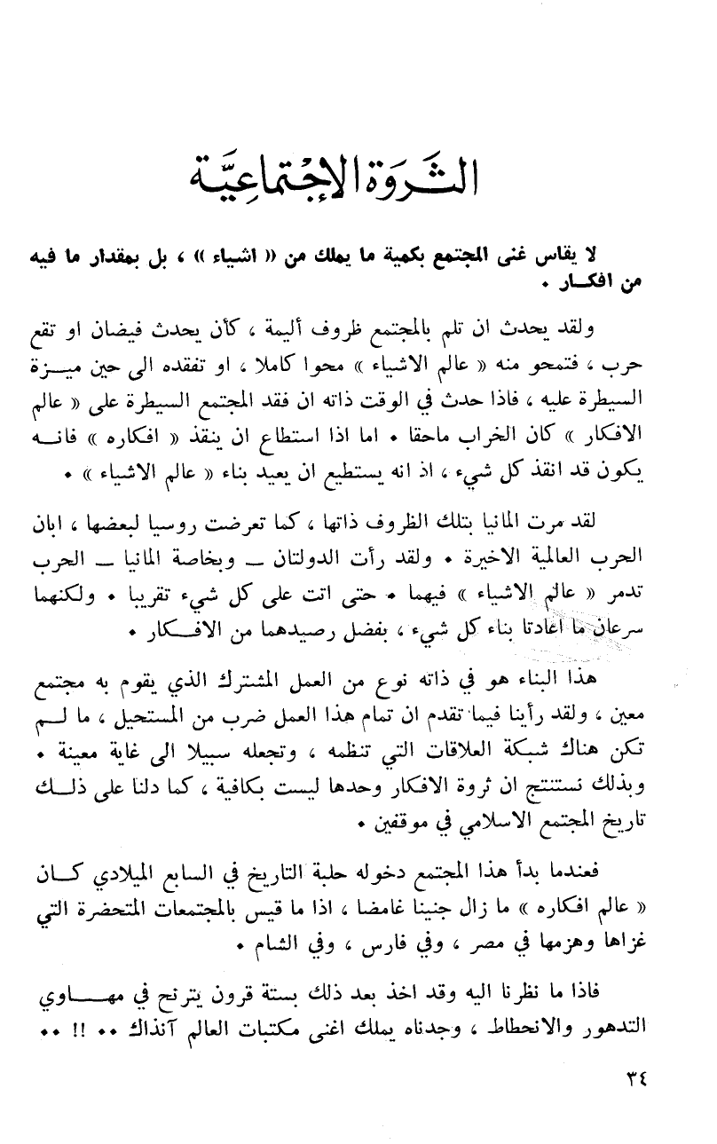 كذلك الأمر في الحياة الاجتماعية: فإن التغييرات التي تتم فيها لا يصح أن تعزى ابتداء إلى (المادة الاجتماعية) أعني: الاقتصاد وكل ما يتصل بالعمل الحسي، وإنما تعزى إلى (العلاقات) التي تحول الشروط السابقة للظاهرة الاقتصادية ذاتها، حين توحد عناصرها في خلق حياة إنسانية منظمة، من أجل الاضطلاع ببعض الوظائف الاجتماعية، في نطاق (العمل المشترك) الذي يصنع التاريخ.