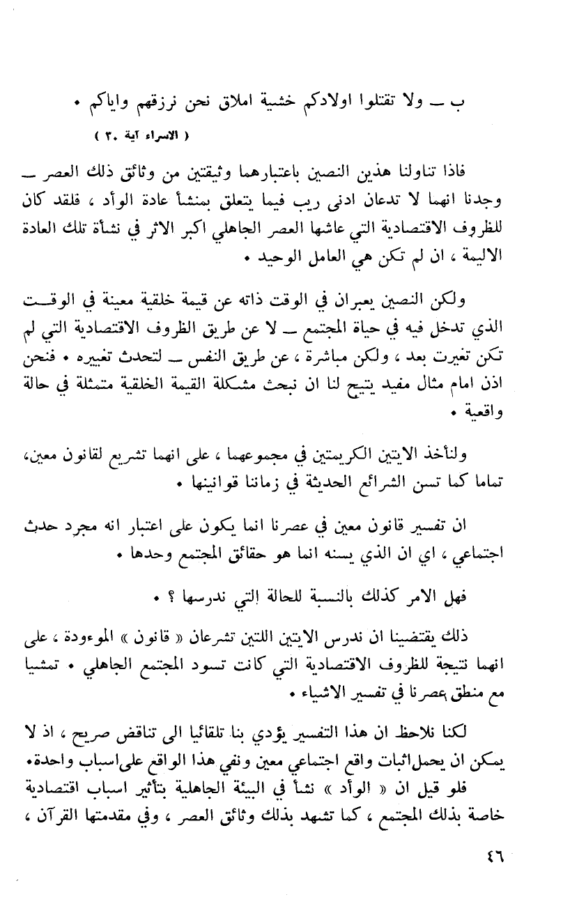 ولدينا إلى جانب هذا شهادة مباشرة على العوامل التي كان لها دور مؤثر في هذه الحالة، ففي القرآن الكريم- بوصفه وثيقة تاريخية- شهادة لا ترد على منشأ عادة وأد البنات، فلقد وجه القرآن إلى عرب الجاهلية خطابه في موضعين:
