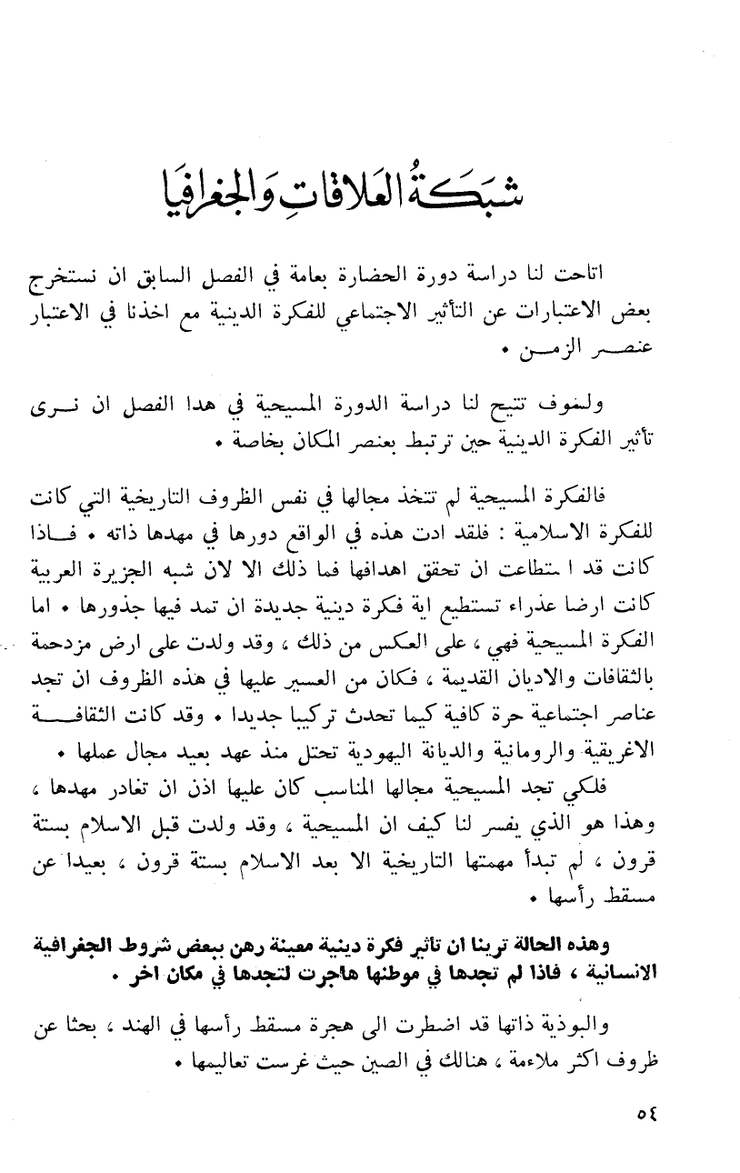فسواء كنا بصدد المجتمع الإسلامي أو المجتمع المسيحي، أم كنا بصدد المجتمعات التي تحجرت اليوم أو اختفت تماماً من الوجود، نستطيع أن نقرر أن الفكرة التي غرست بذرتها في حقل التاريخ هي فكرة دينية. ومعنى هذا أن (الظرف الاستثنائي) الذي يلد مجتمعاً يتفق في الواقع مع الفكرة الدينية التي تحمل مقاديره. كما تحمل النطفة جميع عناصر الكائن الذي سيخرج فيما بعد إلى الوجود. ومعنى هذا أيضاً أن شبكة العلاقات بكل ما تحتويه من خيوط وأطراف، والتي سيتسنى للمجتمع بفضلها أن يؤدي عمله التاريخي- هي ذاتها تعد في حيز القوة، داخل البذرة التي تشتمل جميع أقدارها.