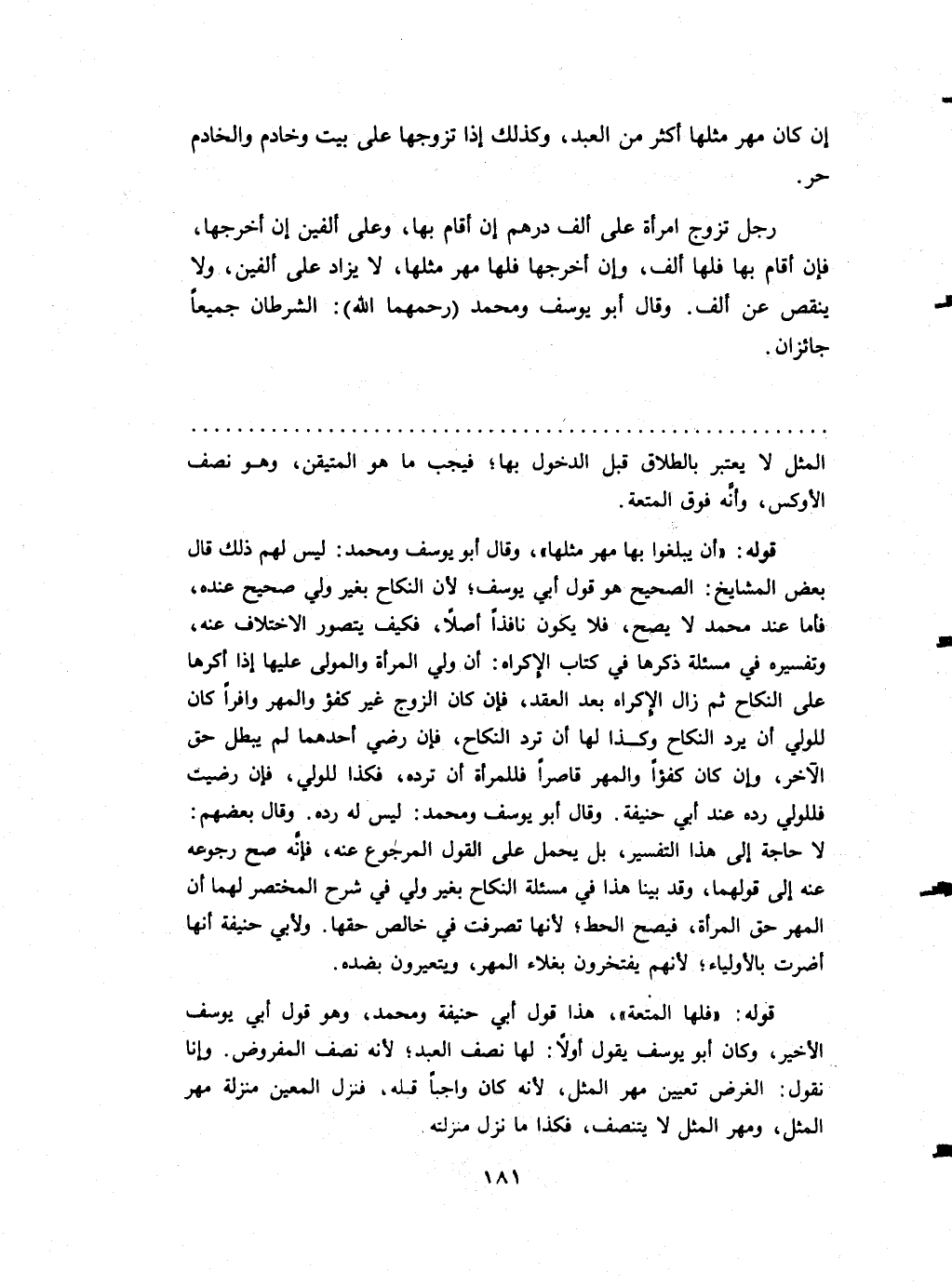 قَوْله أَن يبلغُوا بهَا مهر مثلهاوقال أَبُو يُوسُف وَمُحَمّد لَيْسَ لَهُم ذَلِك قَالَ بعض الْمَشَايِخ الصَّحِيح هُوَ قَول أبي يُوسُف لِأَن النِّكَاح بِغَيْر ولي صَحِيح عِنْده فَأَما عِنْد مُحَمَّد لَا يَصح فَلَا يكون نَافِذا أصلا فَكيف يتَصَوَّر الِاخْتِلَاف عَنهُ وَتَفْسِيره فِي مسئلة ذكرهَا فِي كتاب الْإِكْرَاه أَن ولي الْمَرْأَة وَالْمولى عَلَيْهَا إِذا أكرها على النِّكَاح ثمَّ زَالَ الاكراه بعد العقدفإن كَانَ الزَّوْج غير كفؤ وَالْمهْر وافراً كَانَ للْوَلِيّ أَن يرد النِّكَاح وَكَذَا لَهَا أَن ترد النِّكَاح فَإِن رَضِي أَحدهمَا لم يبطل حق الآخر وَإِن كَانَ كُفؤًا وَالْمهْر قاصراً فللمرة أَن ترده فَكَذَا للْوَلِيّ فَإِن رضيت فللولى رده عِنْد أَبى حنيفَة وَقَالَ أَبُو يُوسُف وَمُحَمّد لَيْسَ لَهُ رده وَقَالَ بَعضهم لَا حَاجَة إِلَى هَذَا التَّفْسِير بل يحمل على القَوْل المرجوع عَنهُ فَإِنَّهُ صَحَّ رُجُوعه عَنهُ إِلَى قَوْلهمَا وَقد بَينا هَذَا فِي مسئلة النِّكَاح بِغَيْر ولي فِي شرح الْمُخْتَصر لَهما أَن الْمهْر حق الْمَرْأَة فَيصح الْحَط لِأَنَّهَا تصرفت فِي خَالص حَقّهَا وَلأبي حنيفَة أَنَّهَا اضرت بالأولياء لأَنهم يتفخرون بغلاء الْمهْر ويتعيرون بضده