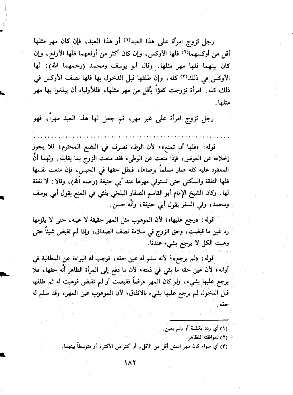 رجل تزوج امْرَأَة على هَذَا العَبْد أَو هَذَا العَبْد فَإِن كَانَ مهر مثلهَا أقل من أوكسهما فلهَا الأوكس وَإِن كَانَ أَكثر من أرفعهما فلهَا الأرفع وَإِن كَانَ بَينهمَا فلهَا مهر مثلهَا وَقَالَ أَبُو يُوسُف وَمُحَمّد (رحمهمَا الله) لَهَا الأوكس فِي ذَلِك كُله وَإِن طَلقهَا قبل الدُّخُول بهَا فلهَا نصف الاوكس فِي ذَلِك كُله امْرَأَة تزوجت تفؤا بِأَقَلّ من مهر مثلهَا فللأولياء أَن يبلغُوا بهَا مهر مثلهَا رجل تزوج امْرَأَة على غير مهر ثمَّ جعل لَهَا هَذَا العَبْد مهْرا فَهُوَ