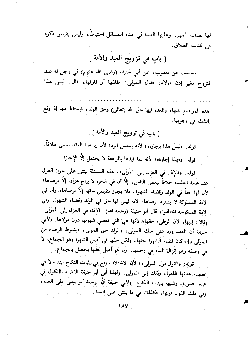 مُحَمَّد عَن يَعْقُوب عَن أبي حنيفَة (رَضِي الله عَنْهُم) فِي رجل لَهُ عبد فَتزَوج بِغَيْر إِذن مَوْلَاهُ فَقَالَ الْمولى طَلقهَا أَو فَارقهَا قَالَ لَيْسَ هَذَا