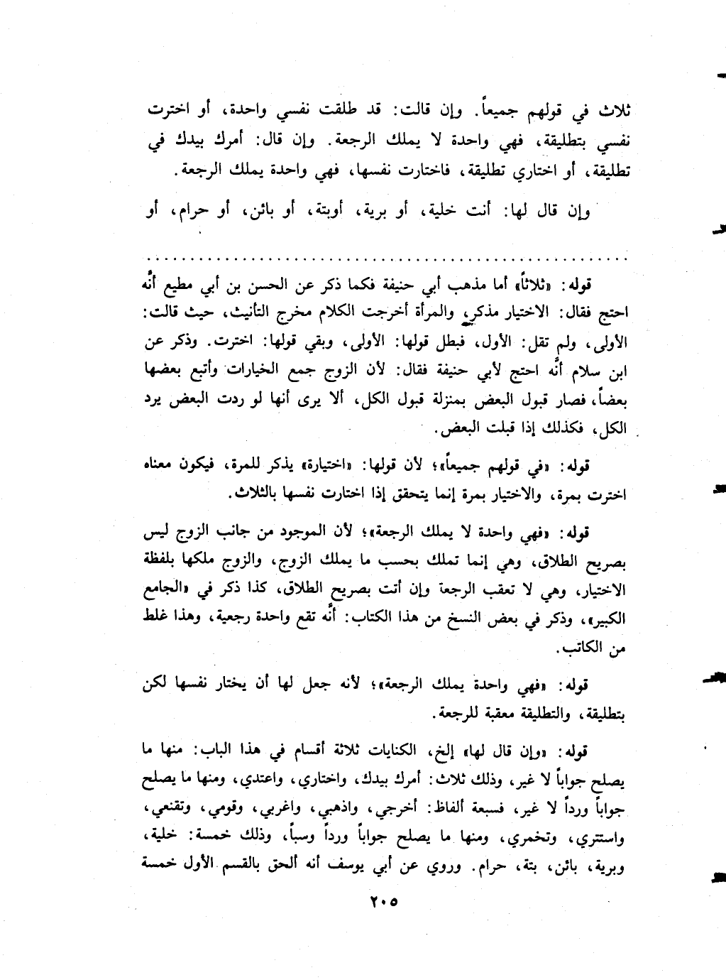 قَوْله وَإِن قَالَ لَهَا إِلَخ الْكِنَايَات ثَلَاثَة أَقسَام فِي هَذَا الْبَاب مِنْهَا مَا يصلح جَوَابا لَا غير وَذَلِكَ ثَلَاث أَمرك بِيَدِك واختاري واعتدي وَمِنْهَا مَا يصلح جَوَابا ردا لَا غير فسبعة أَلْفَاظ أَخْرِجِي واذهبي واغربي وقومي وتقنعي واستتري وتخمري وَمِنْهَا مَا يصلح جَوَابا وردا وسباً وَذَلِكَ خَمْسَة خلية وبرية بَائِن بتة حرَام وَرُوِيَ عَن أبي يُوسُف انه الْحق بالقسم الاول خَمْسَة
