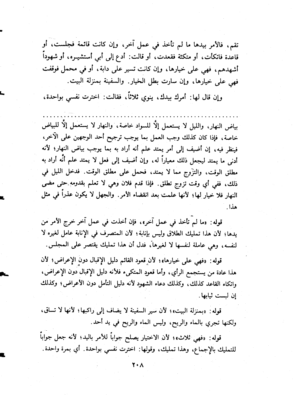 تقم فالامر مَا لم تَأْخُذ فِي عمل آخر وَإِن كَانَت قَائِمَة فَجَلَست أَو قَاعِدَة فاتكأت أَو متكئة فَقَعَدت أَو قَالَت أدع إِلَى أبي أَسْتَشِيرهُ أَو شُهُودًا أشهدهم فَهِيَ على خِيَارهَا وَإِن كَانَت تسير على دَابَّة أَو فِي محمل فوقفت فَهِيَ على خِيَارهَا وَإِن سَارَتْ بَطل الْخِيَار والسفينة بِمَنْزِلَة الْبَيْت
