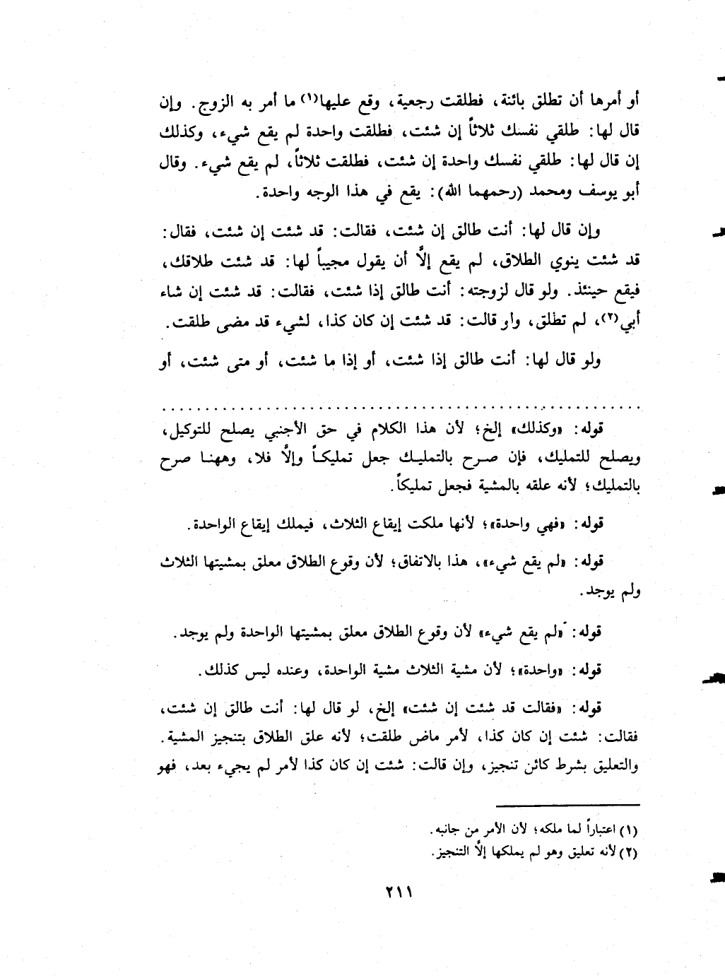 أَو أمرهَا أَن تطلق بَائِنَة فَطلقت رَجْعِيَّة وَقع عَلَيْهَا مَا أَمر بِهِ الزَّوْج وَإِن قَالَ لَهَا طَلِّقِي نَفسك ثَلَاثًا إِن شِئْت فَطلقت وَاحِدَة لم يَقع شَيْء وَكَذَلِكَ إِن قَالَ لَهَا طَلِّقِي نَفسك وَاحِدَة ان شِئْت فَطلقت ثَلَاثًا لم يَقع شَيْء وَقَالَ أَبُو يُوسُف وَمُحَمّد (رحمهمَا الله) يَقع فِي هَذَا الْوَجْه وَاحِدَة