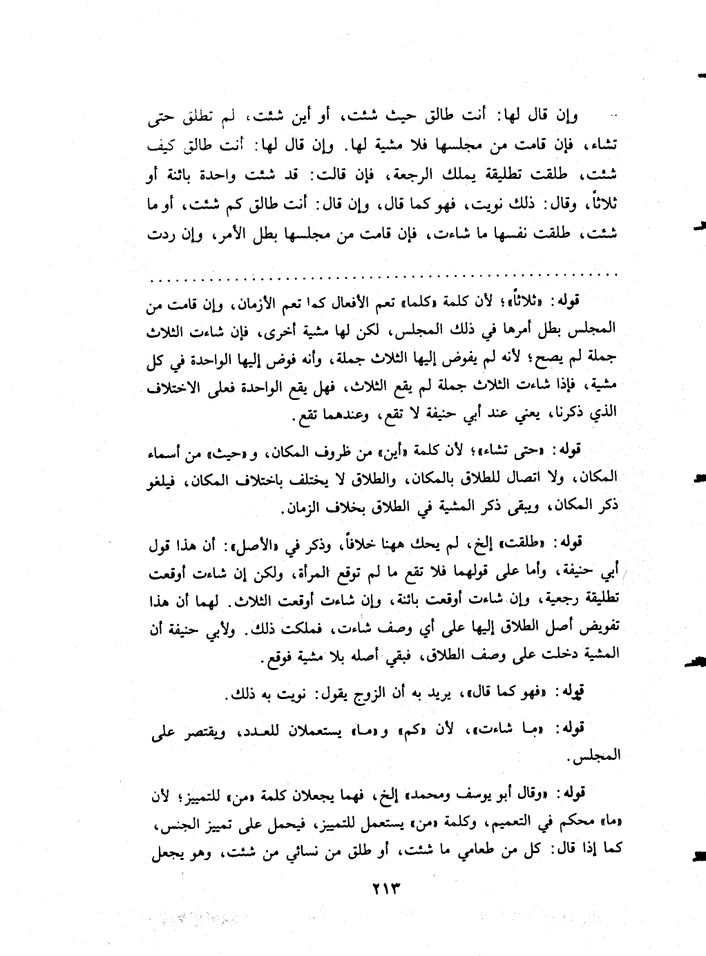 وَإِن قَالَ لَهَا أَنْت طَالِق حَيْثُ شِئْت أَو أَيْن شِئْت لم تطلق حَتَّى تشَاء فَإِن قَامَت من مجلسها فَلَا مشْيَة لَهَا وَإِن قَالَ لَهَا أَنْت طَالِق كَيفَ شِئْت طلقت تَطْلِيقَة يملك الرّجْعَة فَإِن قَالَت قد شِئْت وَاحِدَة بَائِنَة أَو ثَلَاثًا وَقَالَ ذَلِك نَوَيْت فَهُوَ كَمَا قَالَ وَإِن قَالَ أَنْت طَالِق كم شِئْت أَو مَا شِئْت طلقت نَفسهَا مَا شَاءَت فَإِن قَامَت من مجلسها بَطل الامر وان ردَّتْ