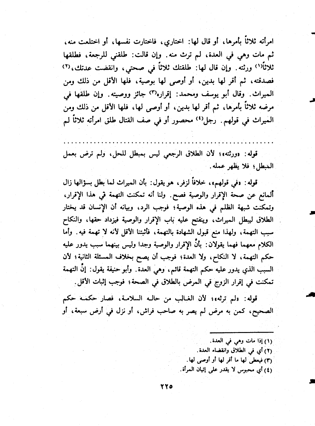 امْرَأَته ثَلَاثًا بأمرها أَو قَالَ لَهَا اخْتَارِي فَاخْتَارَتْ نَفسهَا أَو اخْتلعت مِنْهُ ثمَّ مَاتَ وَهِي فِي الْعدة لم تَرث مِنْهُ وَإِن قَالَت طَلقنِي للرجعة فَطلقهَا ثَلَاثًا ورثته وَإِن قَالَ لَهَا طَلقتك ثَلَاثًا فِي صحتي وَانْقَضَت عدتك فصدفته ثمَّ أقرّ لَهَا بدين أَو أوصى لَهَا بِوَصِيَّة فلهَا الْأَقَل من ذَلِك وَمن الْمِيرَاث وَقَالَ أَبُو يُوسُف وَمُحَمّد إِقْرَاره جَائِز ووصيته وَإِن طَلقهَا فِي مَرضه ثَلَاثًا بأمرها ثمَّ أقرّ لَهَا بدين أَو أوصى لَهَا فلهَا الْأَقَل من ذَلِك وَمن الْمِيرَاث فِي قَوْلهم رجل مَحْصُور أَو فِي صف الْقِتَال طلق امْرَأَته ثَلَاثًا لم